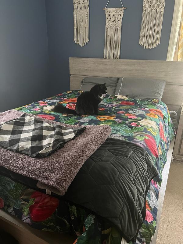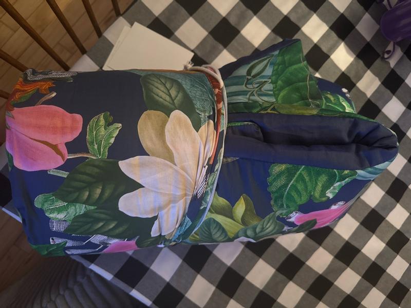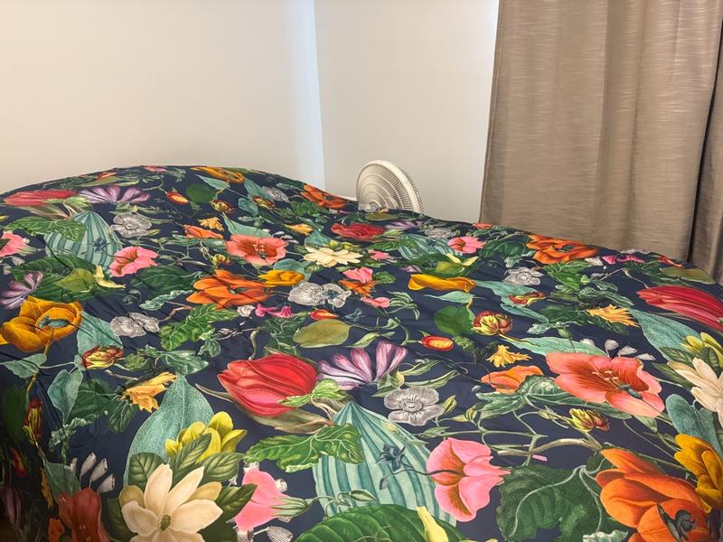 First off, the design is very pretty. It’s so bold and colorful. The other side is solid blue. It was packaged rolled up like a sleeping bag (and will never fit back in the bag) with instructions that it will expand. It did fluff a little bit but it’s still pretty thin. It makes for a good summer comforter. I do think it’s a little scratchy. I hope it softens up after a couple washes.