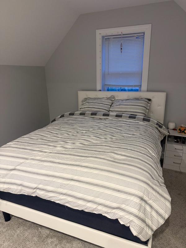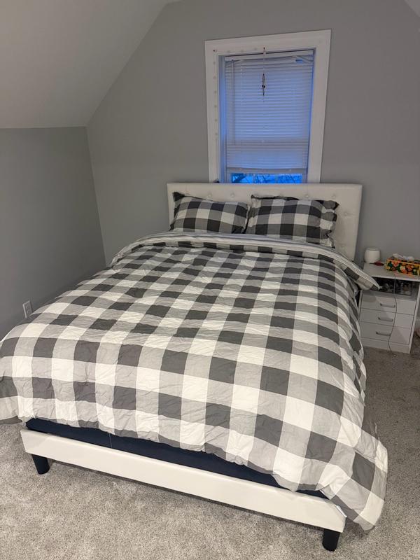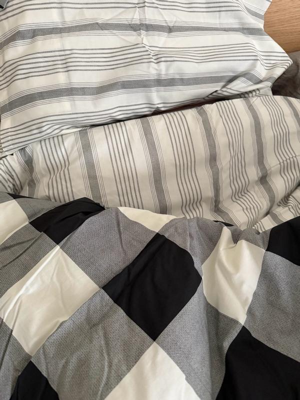 Got this comforter set for my teenage son’s room and he absolutely loved the checkered black and white print and reversible gray stripe print. It’s soft and mid weight, perfect for Texas nights. Unfortunately the quality was disappointing :/ after two weeks of use and only one wash, it had a tear in the fabric in one spot and a scratch in another despite being washed and dried on delicate.