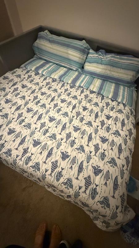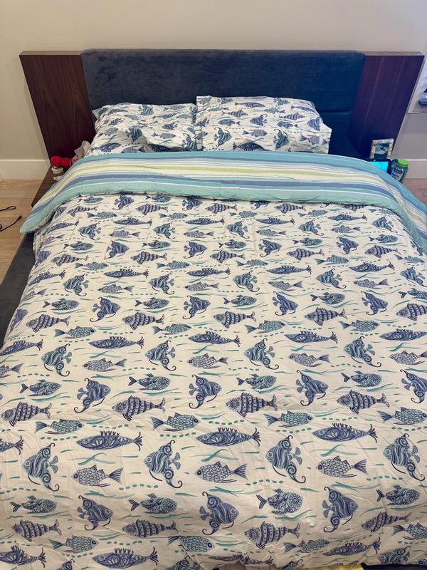 The comforter set came in a nice and compacted drawstring bag. The comforter is fluffy and expands after coming out of the bag. It's nice that the pattern is reversible - I was feeling the fishes today. This specific comforter has stripes on one side and fishes on the other. I was a bit surprised because the material on the comforter and pillow case wasn't as soft as I expected. It was a little rough feeling. But overall, it's a nice design and does the job!