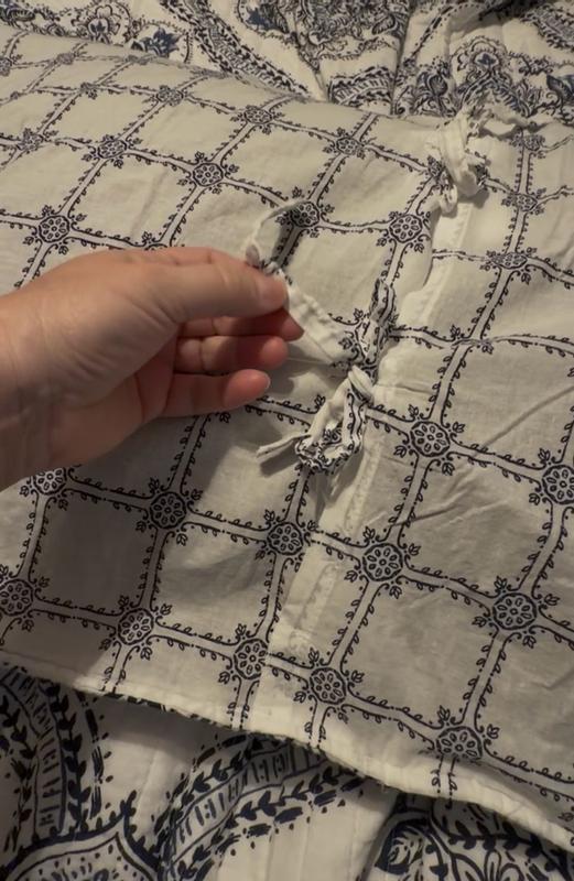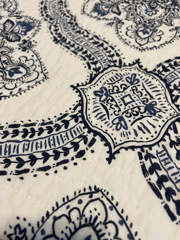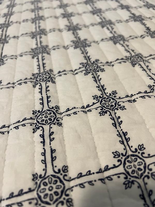 The Levtex Home Letana Navy Quilt Making Size Set is so beautiful. This light weight quilt set comes with two king size shams that tie in the back. Made out of cotton and is also machine washable. It's a great fit for my king bed and I love the feel of this cotton. Looking at this quilt from a far and close up gives high end quality.