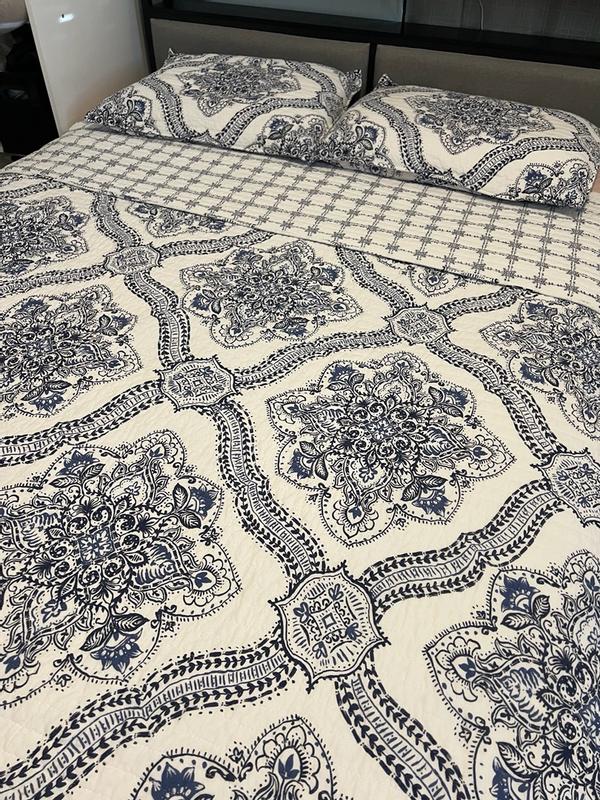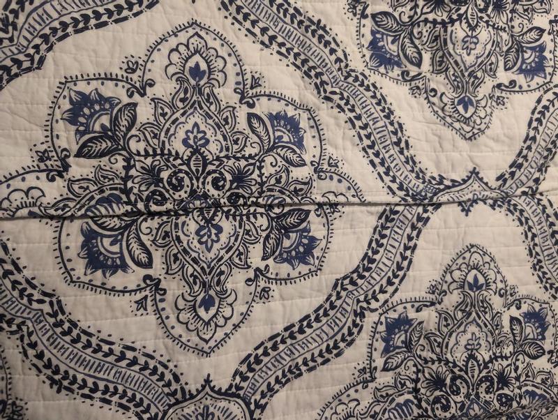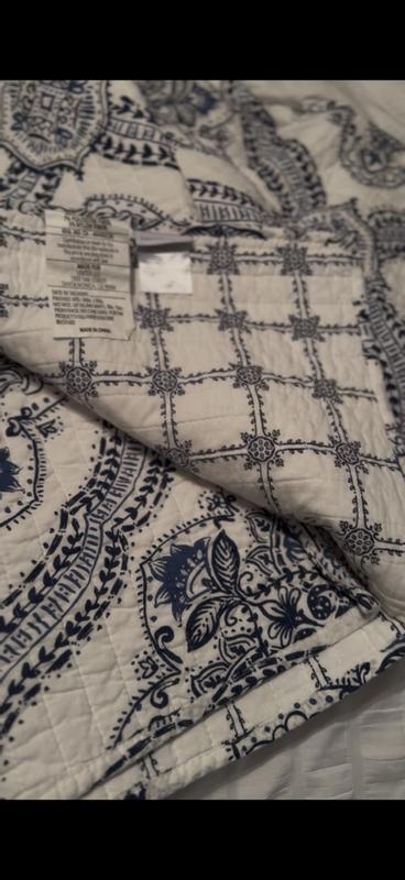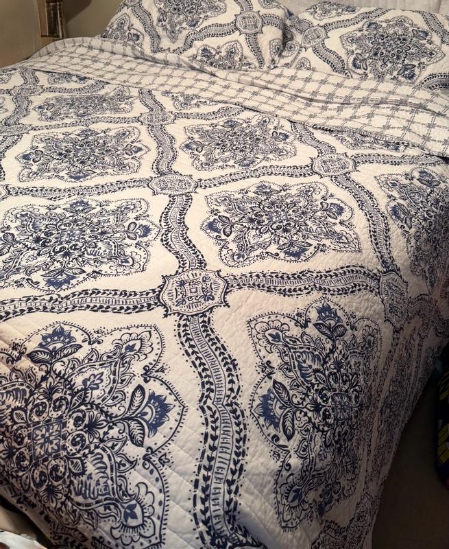 This Lentana Navy Quilt Set by Levtex Home is absolutely beautiful. It has a high quality feel and weight and is very comfy too. The set includes 1 king quilt and 2 king shams .. and it fit our king size bed perfectly. The shams have adorable little ties to add a touch of beauty to the set. Plus, the pattern and colors are vivid and bright. I love using a quilt on my bed and am so happy to have found this set. Love it!