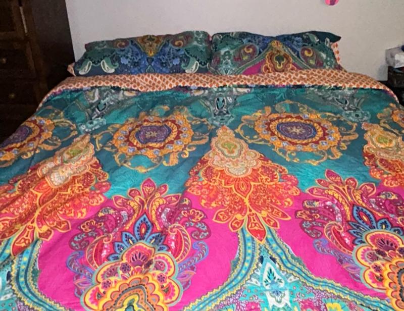 Thank you so much Influenster for the chance to have this beautiful comforter, it fits my bed perfectly for a full/queen and plenty over the sides and the design is absolutely gorgeous, I really really like it, the pillow cases fit nicely as well and I've got bigger pillows so I was worried but they fit no problem at all and it's nice and thick it'll definitely keep me warm! I totally recommend you go buy this