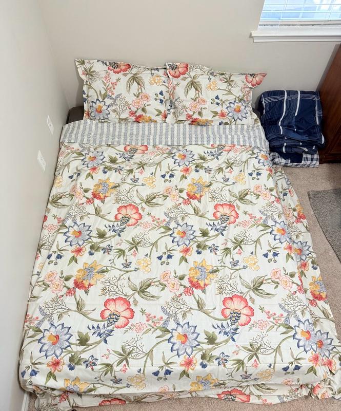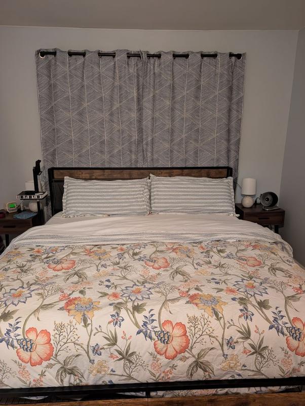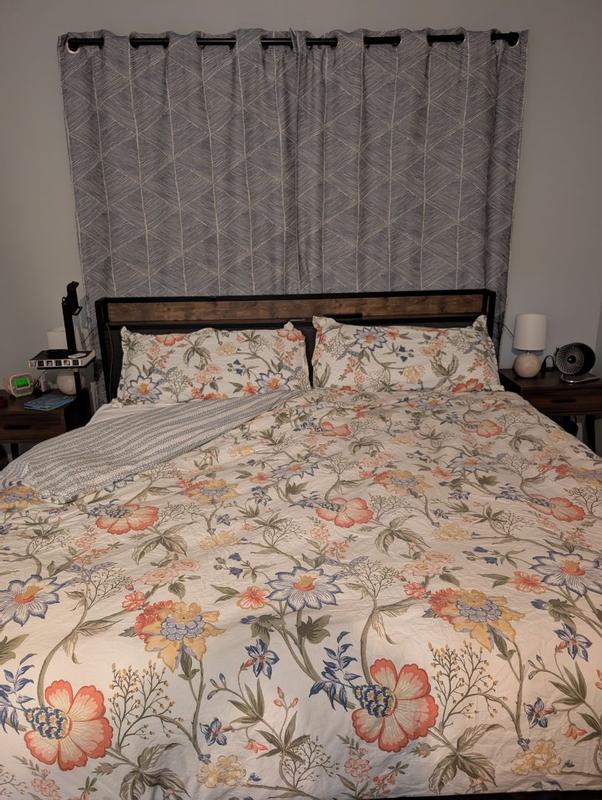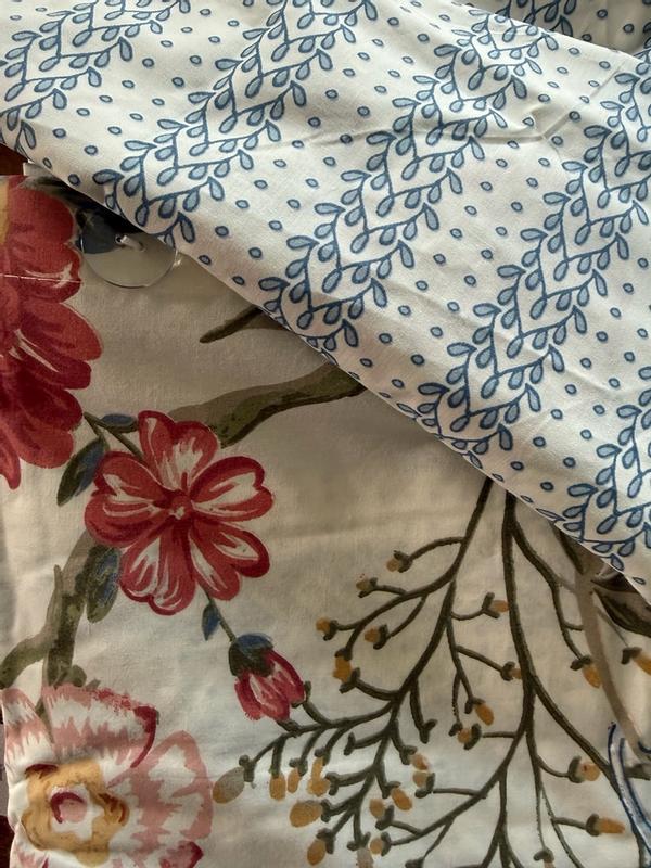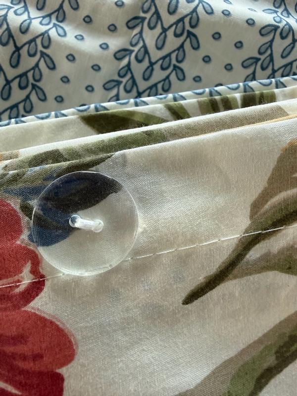 This set is the cutest and I'm so happy it matches our curtains! I love that the duvet cover is reversible, so you can have a blue stripe-y moment or a floral moment depending on your mood. The King set comes with one King duvet cover, and two (KING SIZED!!) pillowcases (also reversible, see photos). I took off one star because, though it's gorgeous, it wrinkles incredibly easily and the fabric is not very breathable and is slightly scratchy. Overall, it's still comfortable though and I've had 2 great sleeps with it so far. Additionally, my husband says the duvet cover was a bit of a pain to put on because there are SO MANY buttons. Overall, though, this is a cute set that I'm happy to add into our linen rotation!