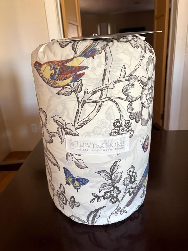 The Levtex Home Mockingbird Comforter Set arrived this past week, and it came well packaged and within its own drawstring bag. I washed it as soon as I got it, and while being a king size, it still fit my washer. I dried it on delicate and placed it in my master bedroom. This comfort is cozy, but if you prefer a bit more warmth in the winter, a lightweight blanket underneath made it the absolute perfect for the cold winter nights in my area. I plan to remove the extra lightweight blanket in the spring. Also important to note is that this bedding is reversible and comes with two very durable pillow shams. I also loved that these colors are fairly neutral and can be dressed up further with pops of color matching the beautiful mockingbirds on the comforter. Overall, i am thrilled with this bedding and would recommend this brand to anyone in the market for a classy looking bed set.