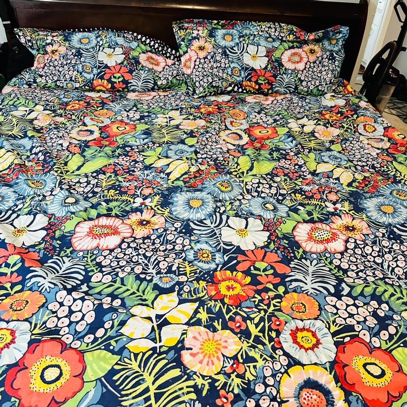 The Levtex Home duvet cover in Night Garden is a beautiful duvet cover set. Although I do wish the colors were darker and more vibrant, it is still a nice looking print. I had hoped the navy blue background was darker and the flowers to be brighter and vibrant. The closure to the duvet is a button closure which is less preferable to a zipper closure but it works fine. The reverse side is a blue and white print which I also really like and will use! The material is not soft to the touch but a little more stiff but it works for my needs as well. It is easy to launder and maintain. Time will tell as to how long the material will last with day in and day out use.