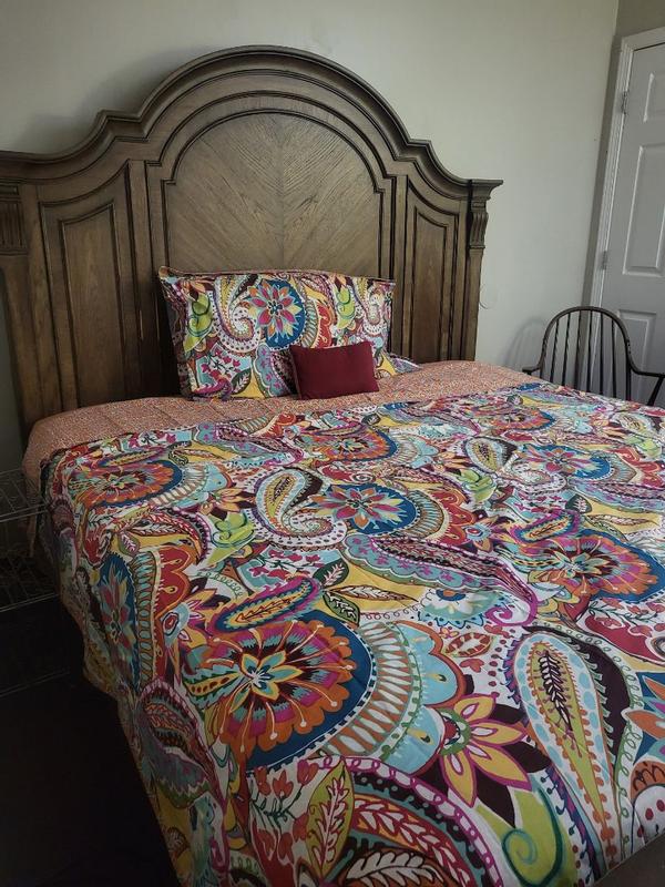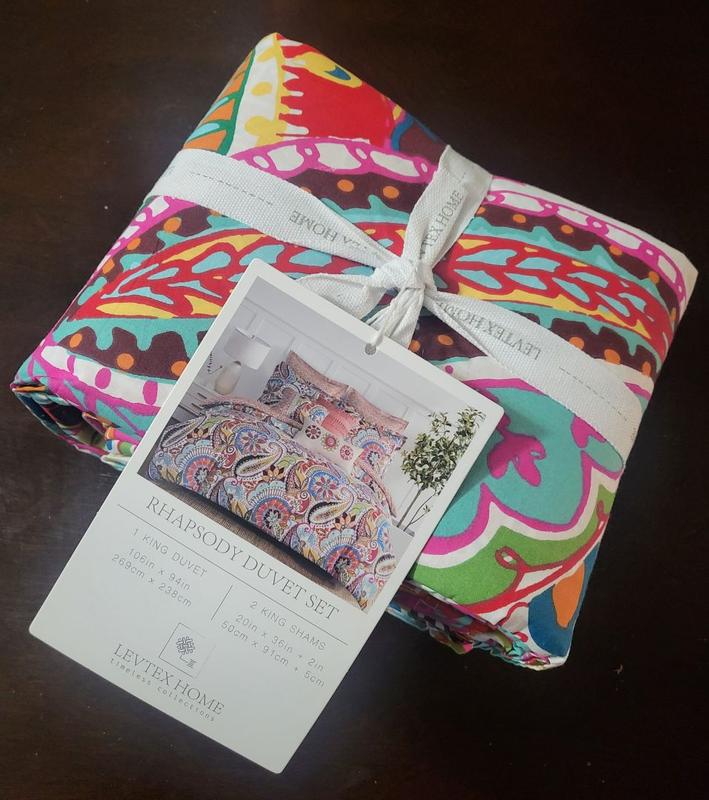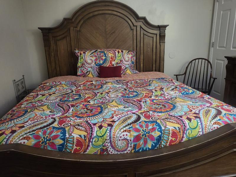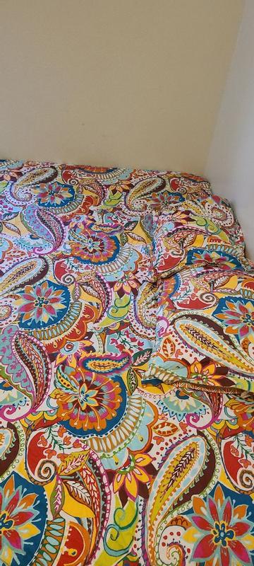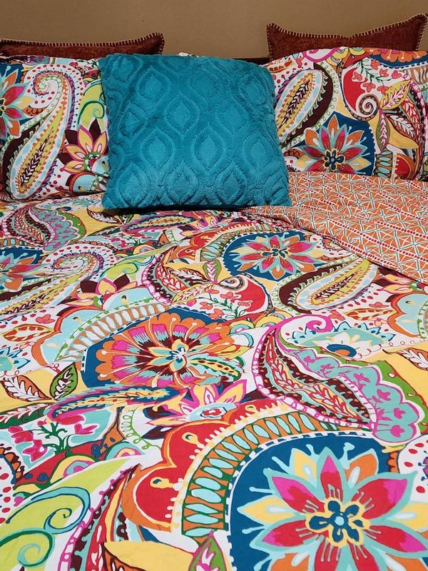 Levtex Home Rhapsody Duvet Cover (+2 shams) Set has such a vibrant appearance. The bohemian flair style: bold paisley-floral designs instantly uplifts my mood. It also complements my wooden bed frame nicely. I enjoy getting creative by accessorizing my king-size bed with a plethora of throw pillows in varied colors, textures, and patterns. It has a reversible side that's covered in a geometric (orange, turquoise, white, and red) pattern, too. With that being said, I'm able to switch it up anytime I please! The cover felt somewhat stiff against my skin in the beginning. But as I used the bedding often, the stiffness began to ease off. For the most part, the bed linen is a breathable cotton fabric, fits each corner (of the bed) perfectly, is lightweight, has secure button closures and interior ties in all four corners, soft, machine wash friendly, and offers warmth throughout the night. The bedding is great to place over the bed year-round. There's nothing like being cozied underneath the Levtex Home Rhapsody Duvet Cover - drawing, reading a book, listening to music, or just relaxing-considering the room is my comfort zone. I definitely recommend this lovely bedding for those who like to brighten up their room (s).