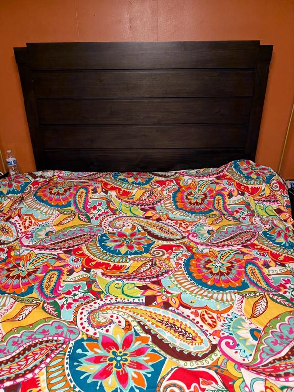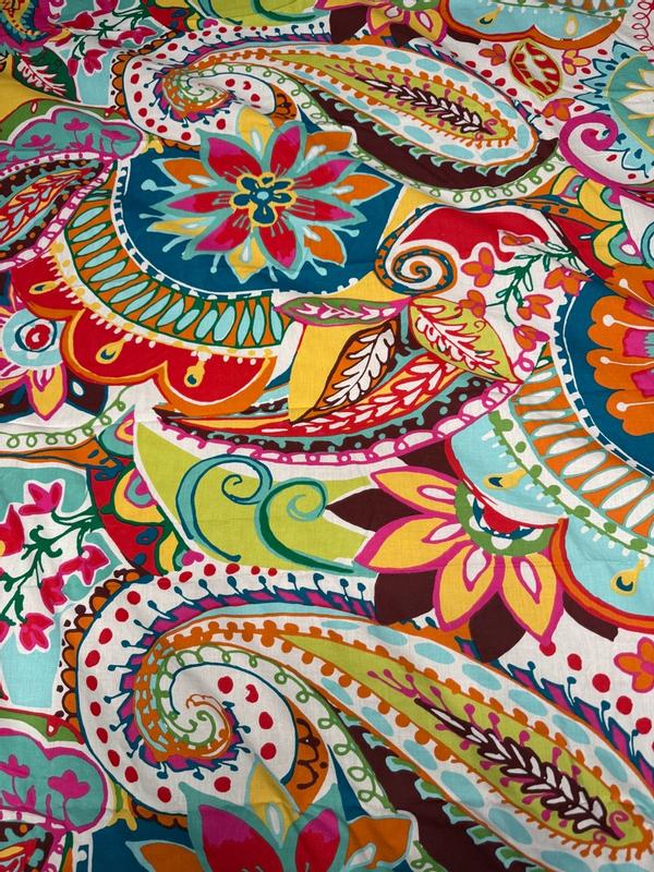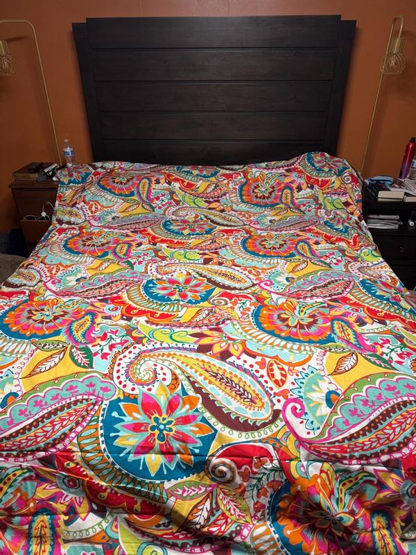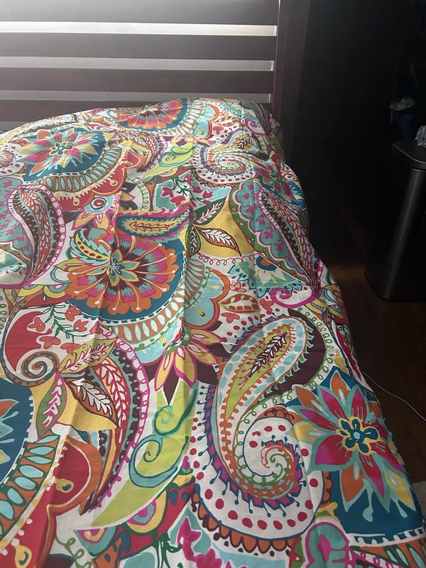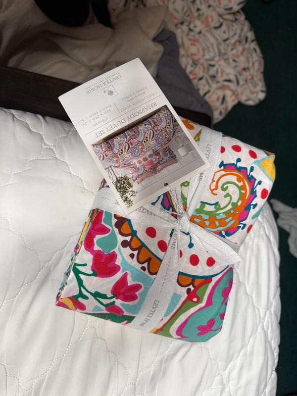 Levtex Home Rhapsody Duvet Cover (+2 shams) Set has such a vibrant appearance. The bohemian flair style: bold paisley-floral designs instantly uplifts my mood. It also complements my wooden bed frame nicely. I enjoy getting creative by accessorizing my king-size bed with a plethora of throw pillows in varied colors, textures, and patterns. It has a reversible side that's covered in a geometric (orange, turquoise, white, and red) pattern, too. With that being said, I'm able to switch it up anytime I please! The cover felt somewhat stiff against my skin in the beginning. But as I used the bedding often, the stiffness began to ease off. For the most part, the bed linen is a breathable cotton fabric, fits each corner (of the bed) perfectly, is lightweight, has secure button closures and interior ties in all four corners, soft, machine wash friendly, and offers warmth throughout the night. The bedding is great to place over the bed year-round. There's nothing like being cozied underneath the Levtex Home Rhapsody Duvet Cover - drawing, reading a book, listening to music, or just relaxing-considering the room is my comfort zone. I definitely recommend this lovely bedding for those who like to brighten up their room (s).