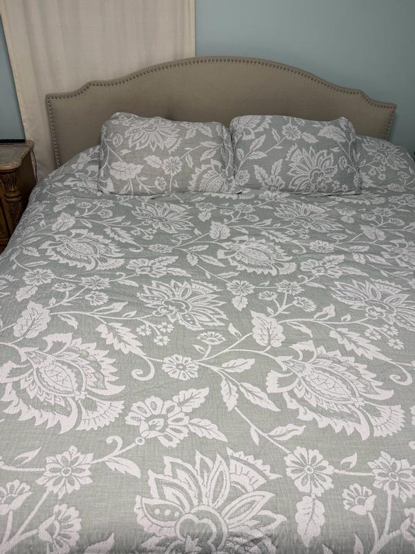 I love the pattern on the Levtex Sarah Natural Comforter Set—it’s truly beautiful and makes my bedroom feel calm and elevated. The weight is perfect: cozy without feeling heavy. The top layer has a soft, gauze-like fabric that feels nice, though it did have a very faint odor out of the package that needed a little time to settle (not noticeable when in bed). It feels well-made and durable overall. My only small note is that it runs slightly smaller than my other king comforters. Still, it’s a great everyday comforter with a gorgeous design and comfortable weight.