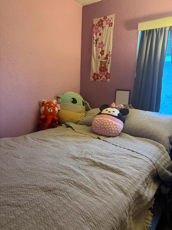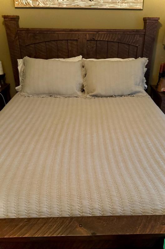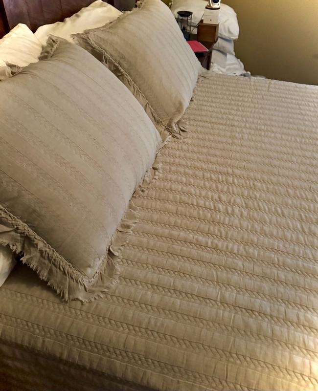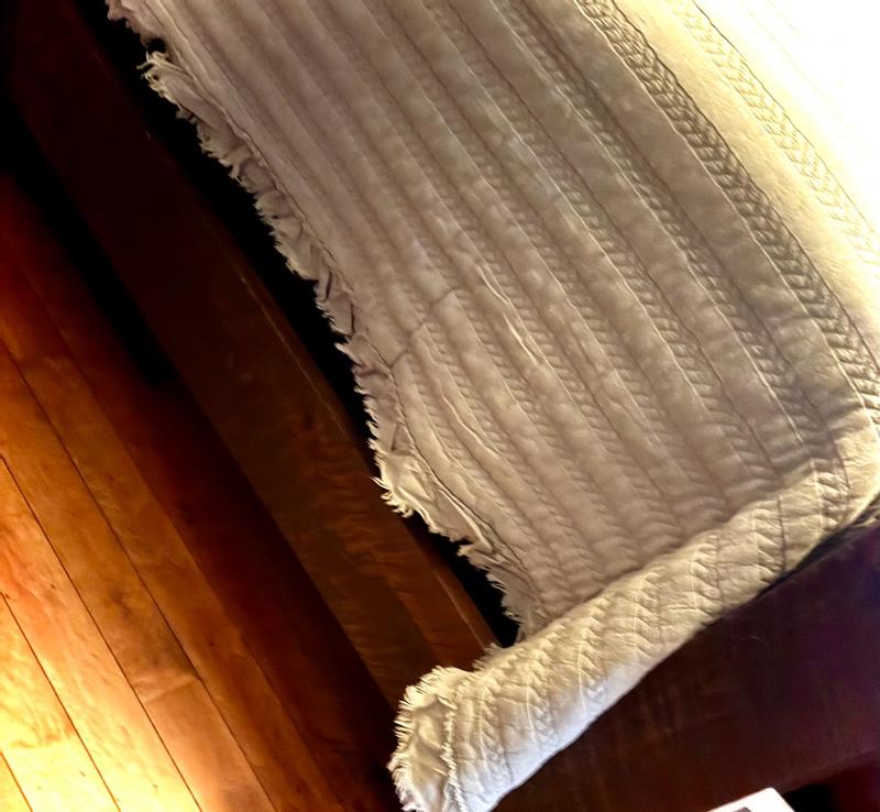 Oh gosh I just love this set! It’s so neutral and versatile! It’s a three piece set having the quilt and two shams. It’s so cozy but great for year round. I love that I can add other throws or blankets with a pattern to give it a mix. It’s warm but not heavy. Completely machine washable and it comes out nicely after washing and drying. I absolutely love the ruffled/frayed edges to give it a chic yet homey feel to my room. It’s 100% cotton and has a 100% polyester fiber batting inside for a little spring to it. It was so easy to put on my bed and so was the shams. I’m absolutely adore this set and thinking about buying in other colors as well. It seems well sewn to last for a long while, it’s beautiful!