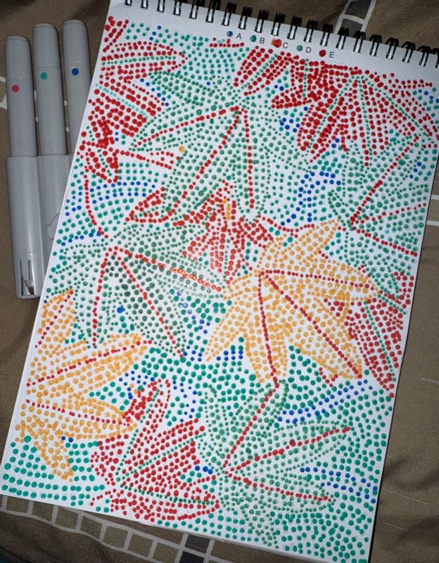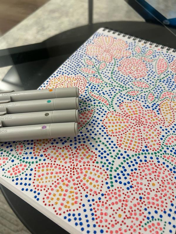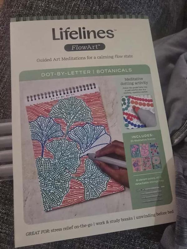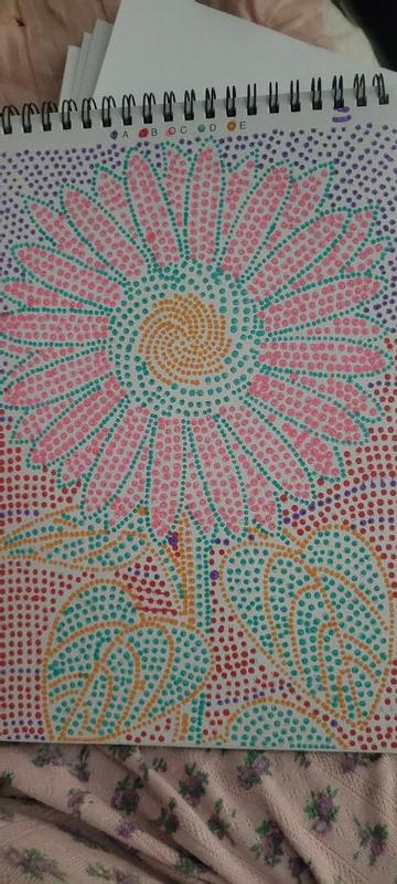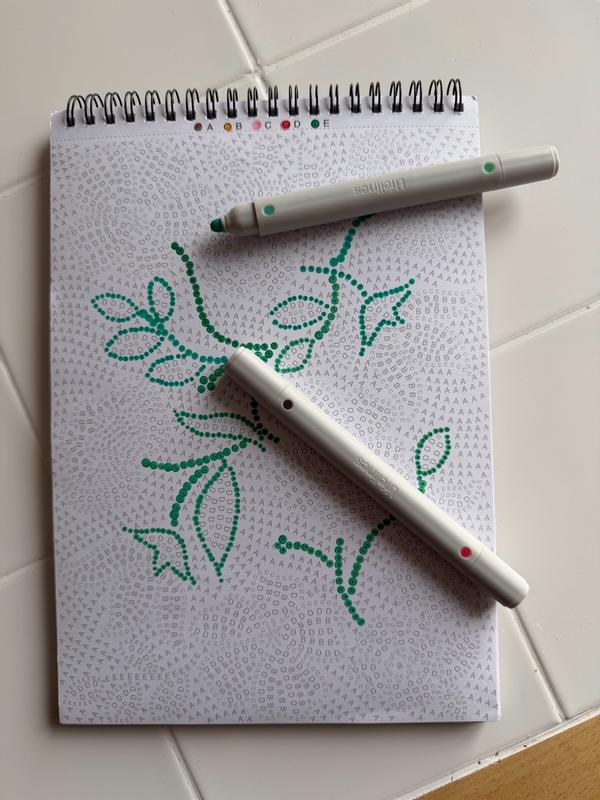 These dot by letters are neat to do but do take a long time to finish. It does come with several pages with different designs so it keeps me busy. Along with the note pad/book that they come in, I like that it comes with a marker tray on the back that holds 4 markers and each have a different colored marker on each side so a total of 8 colors. The tray also detaches. Even though it does seem like each design takes forever to finish, I do enjoy doing these & seeing how the botanical design looks after doing the dots & adding color. Very cool and interesting looking.