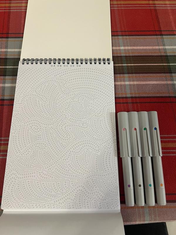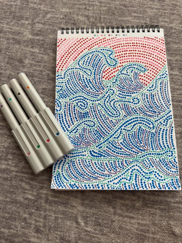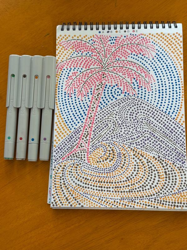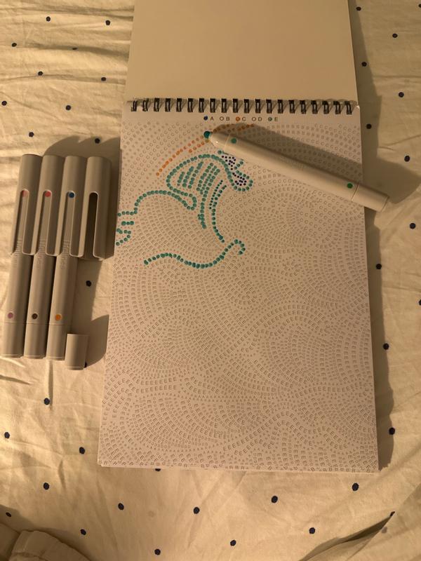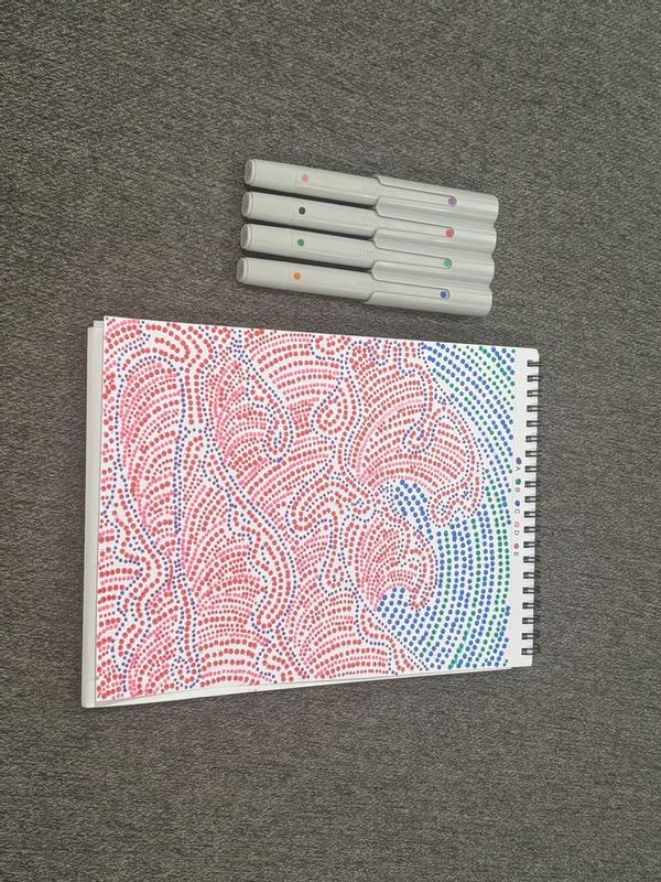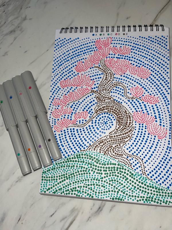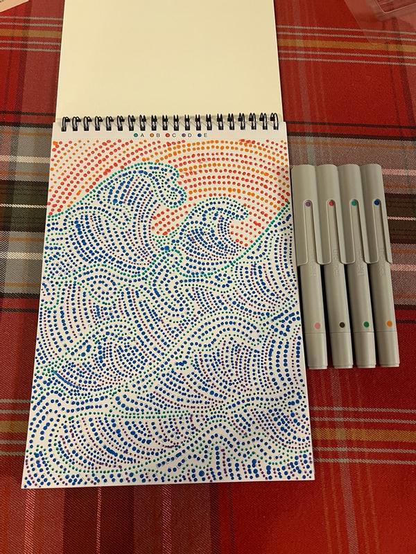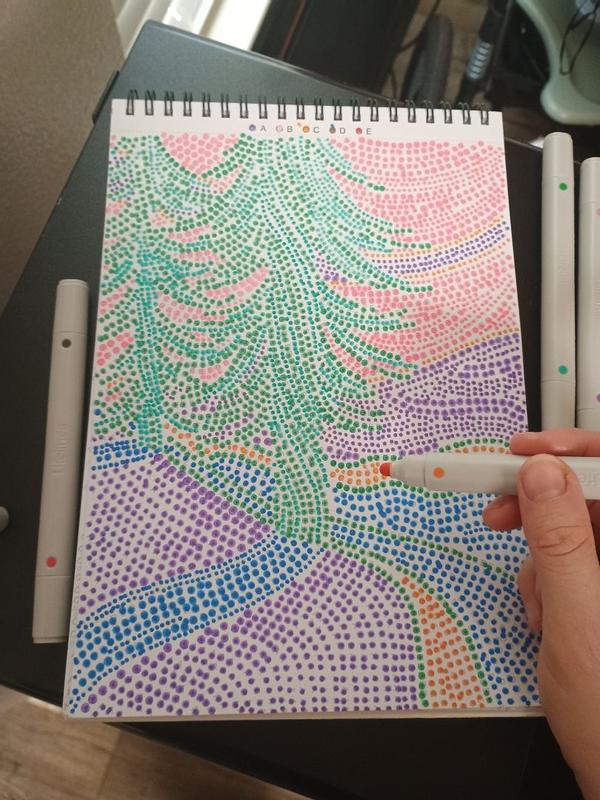 Coloring this today was an amazing experience. My expectations were completely exceeded. I thought it would feel like a coloring book but it was more than just coloring. I felt like you could see more of the picture you are creating each step of the way and it was a soothing experience. I literally felt so calm coloring this in. I like how this explained different ways to make dots too to make the picture. It took longer than expected to finish but that is a good feature because it is a mental stimulus that also helps soothe and calm the mind. I have to say it was a fascinating and unique experience that I want to get more of these to gift friends and family for the holidays. I used my finished product as stationary. The paper is thick enough that the marker does not bleed through so on the blank side I wrote the letter. It looked so beautiful the letter in the mail. This could be great art to have in the home or as stationary. I completely recommend this it is a great value and will last me a long time. Lastly the markers are high quality and I like how you can reattach the markers to the back of the notebook. Which means I will not lose the markers which is a fantastic feature.