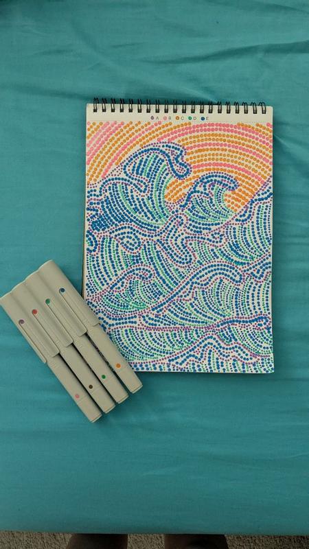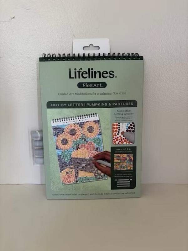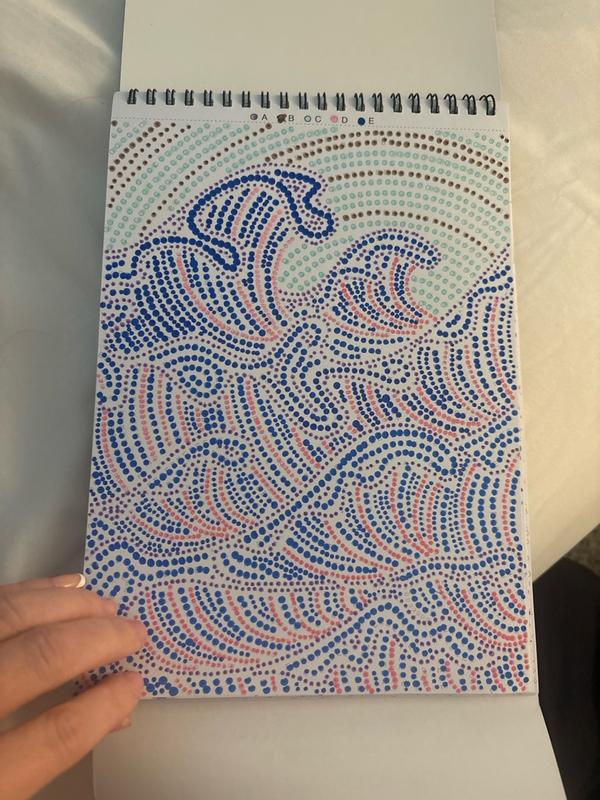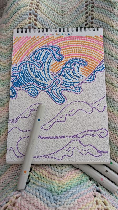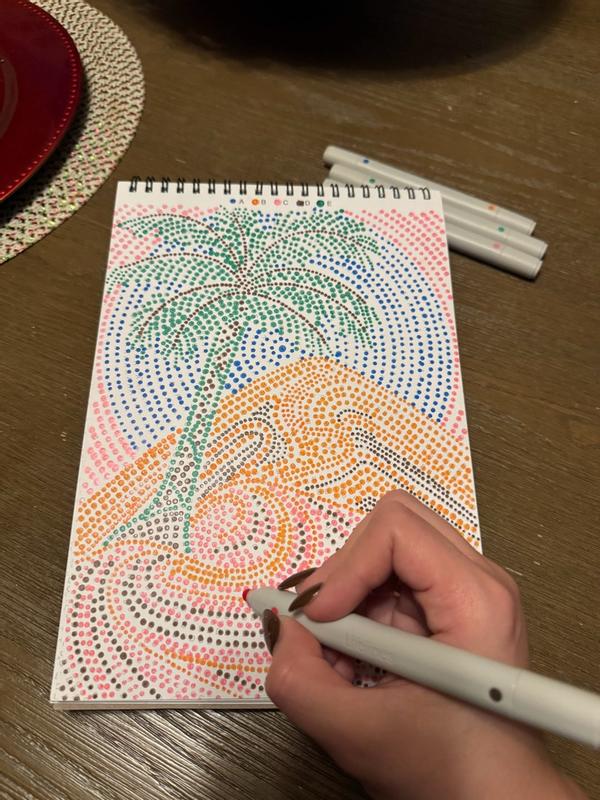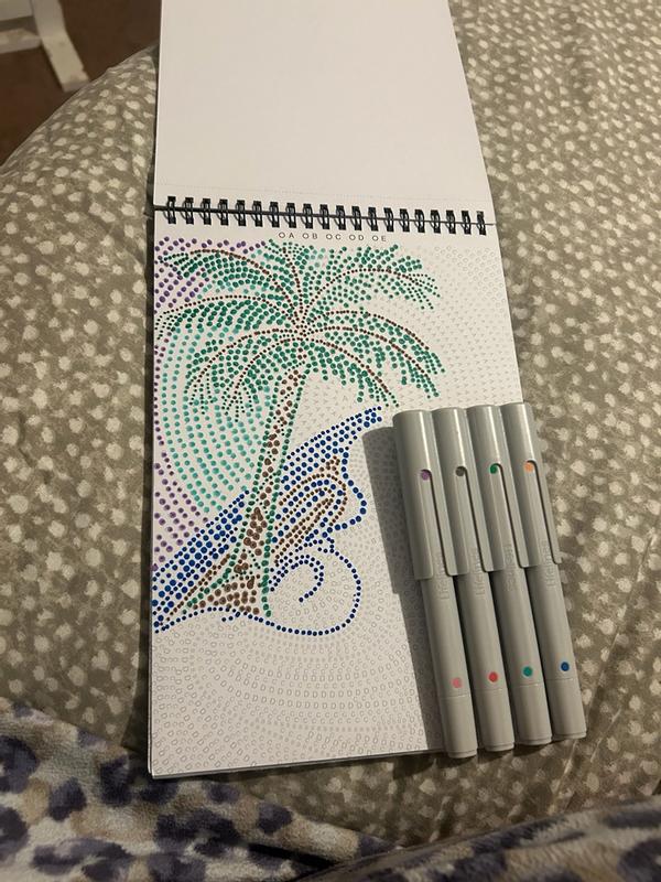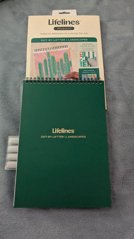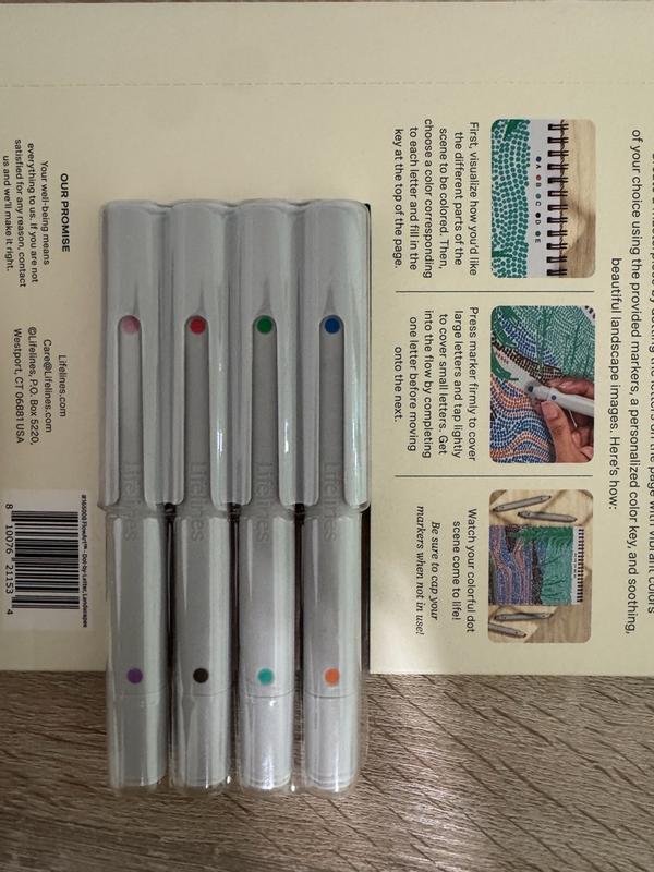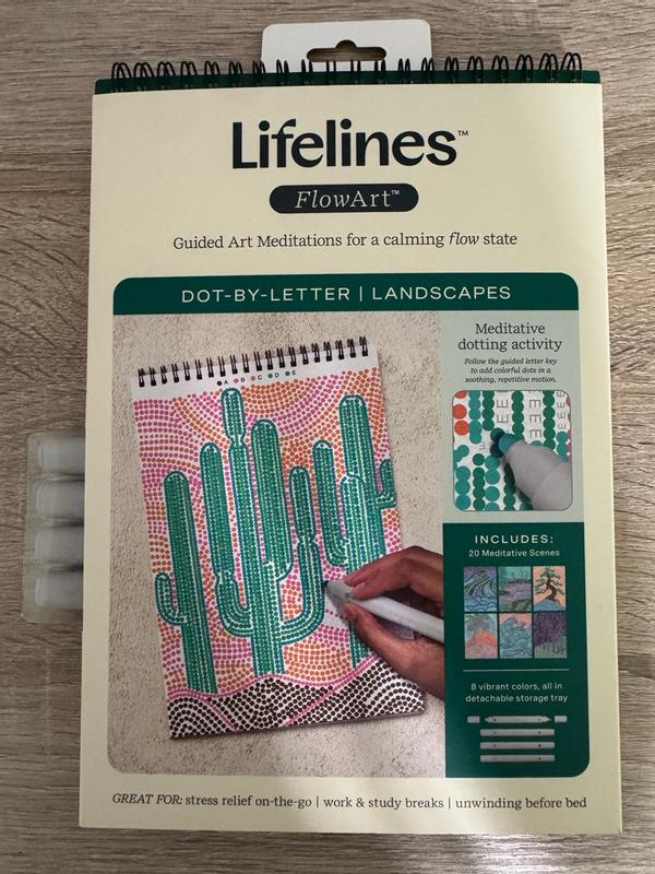 Lifelines FlowArt - Dot-By-Letter [Landscapes] is next level coloring for adults. It's not like traditional coloring where you need to focus and have tons of colors. It was very relaxing to pick a few colors and zone out dotting away. I would say it's similar to the diamond art with less tiny pieces to get lost. The pad is pretty sturdy to use anywhere especially on the couch or in bed. It comes with 4 double-sided markers in a convenient storage cap that clips on to the back of the pad so you won't lose it on the go!! I liked how the markers have a flat side making it easier to hold for long periods of time, and they won't roll away when you put them down. The blunt marker tips make transitioning from small to larger dots a lot smoother. Trying to pick what colors I wanted to use at first was a bit overwhelming, but the QR code was extremely helpful, it brings up a few suggested colors for all of the pages, which gives you a better idea of what each image is.