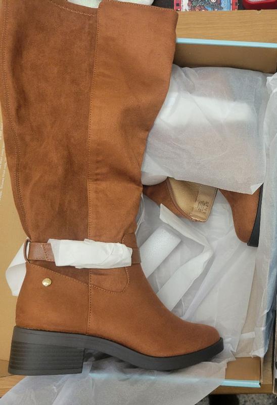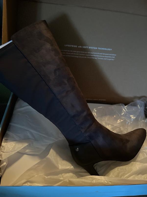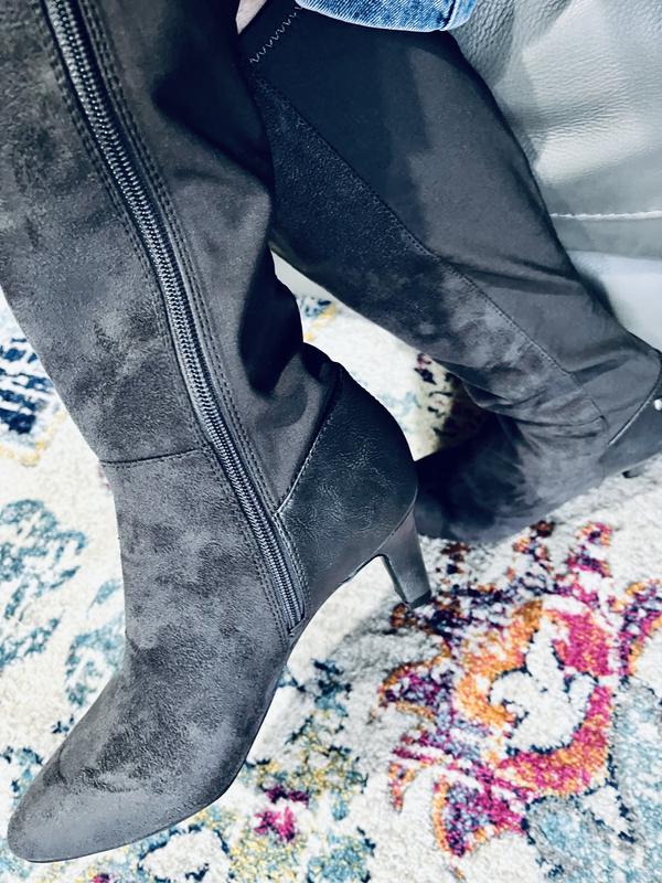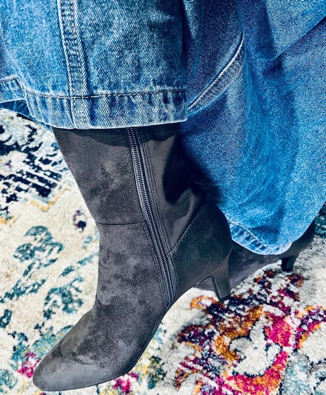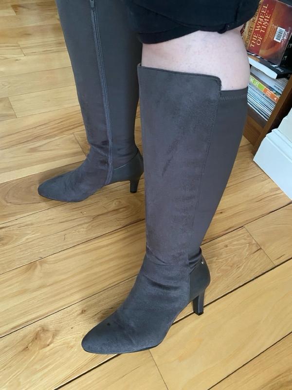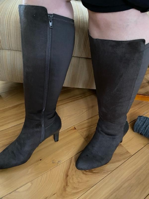 I love the style of these boots in the brown. The two-toned material gives them something unique over the typical boot. I also love that the heel is not too high, and they look great with my “just below knee” dresses. However, if feel they run a bit small. I typically wear 7.5 in boots and heels but these were pretty tight the first time I wore them with stockings and hurt my feet so bad. It was too late to return them after I wore them, so I’ve worn them a couple more times with socks and they’re breaking in. But I wish I had gotten the 8; I am sure they would be very comfortable otherwise. Btw I did not get the wide calf version