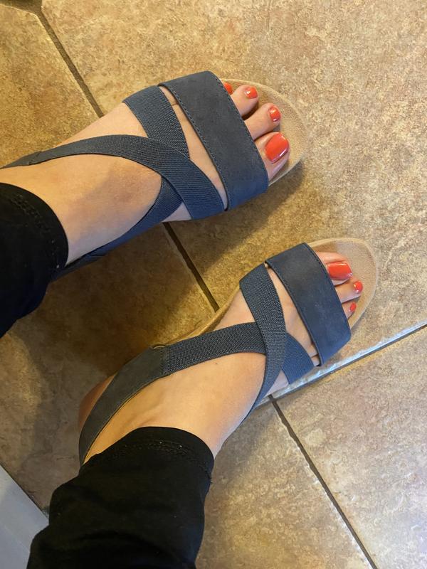 Dressy, casual wedge sandal is comfortable. Straps fit securely across foot. Please make this wedge in a lower 1.5" heel, making it an every day go-to sandal.