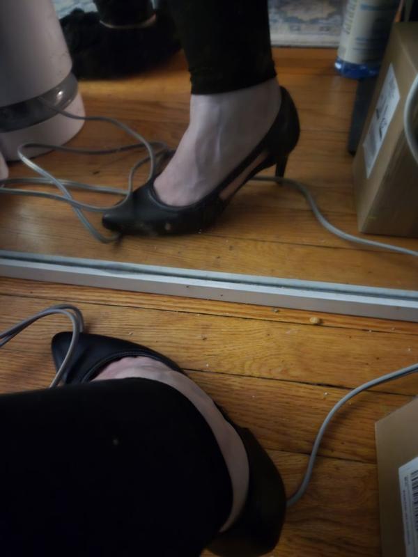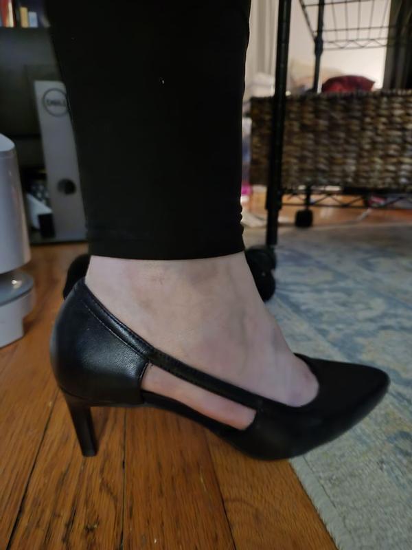 These pumps are very comfortable with a good stretch and a low heel. They would be five stars if not for the cut outs, which don't make a lot of sense to me for a work shoe.