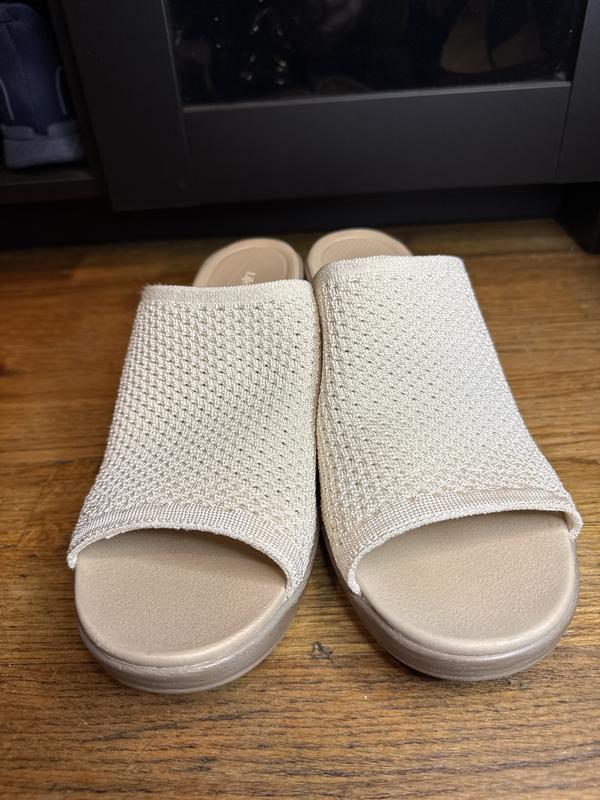 I haven't warn these out yet but compared to all the other sandals I tried these have the softest foot bed. The fabric holds my foot well and allows the boney parts of my feet to have room & also be covered. The heel and platform is a bit clunky, but gives a nice height without the stereo pitch of a higher heel.