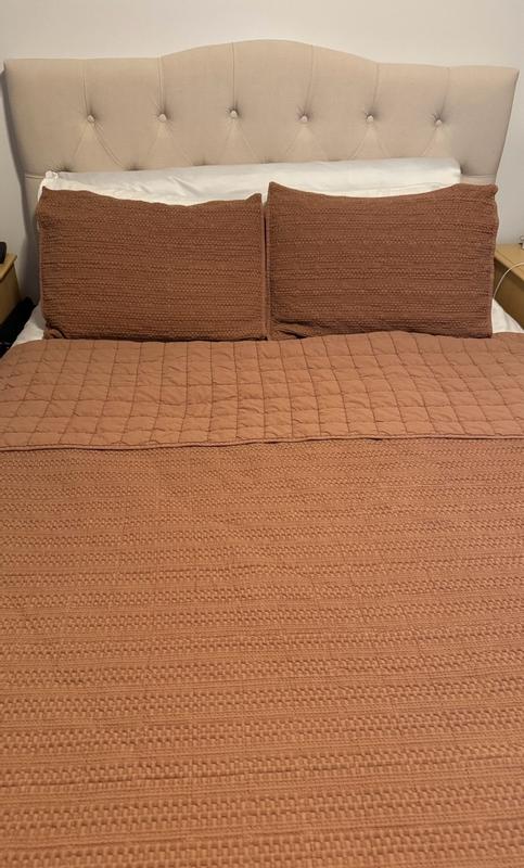 I’m really impressed with the GreatBayHome Genevieve quilt set. The 100% cotton honeycomb waffle texture feels soft and cozy, and the garment-washed finish gives it a relaxed, lived-in look. It’s lightweight but still warm, and the quality feels really durable. The only downside is that I thought the orange color would be slightly different, but overall I love it!