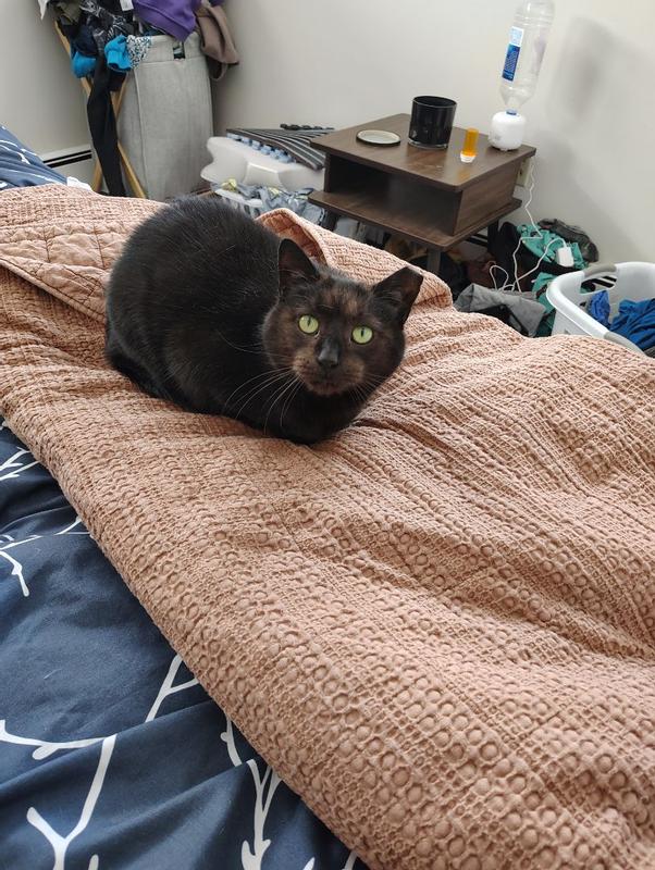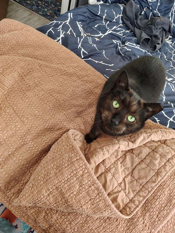 I love this set. The color is really nice soft rust that goes with a lot of decor and creates a really nice guest room environment. I was surprised with just how soft the fabric was, and I love that it's 100% cotton for sensitive skin. The top is structured and the underside is nicely quilted and really nice on the skin. And a thing layer of insulation means this is nicely warm in the winter but cool enough to use in any season. The comfiness is clearly demonstrated in my photos - seconds after laying the blanket down, my cat climbed right in for a snuggle, and another cat meowed with jealousy at this comfy resting place.