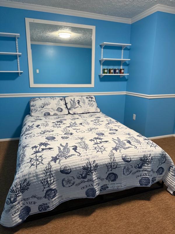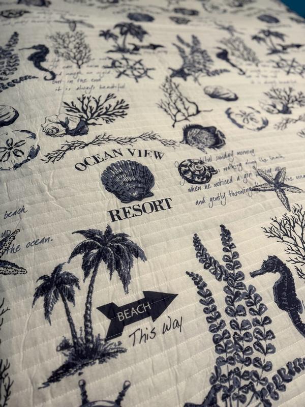 Super cute quilt. I’m the photos I put the striped design up but it’s reversible!!! The other side is a super cute beach theme. The quality is nice, I do wish it was a tad thicker but works perfect for my spare bedroom! The fit is perfect! Would recommend for sure!