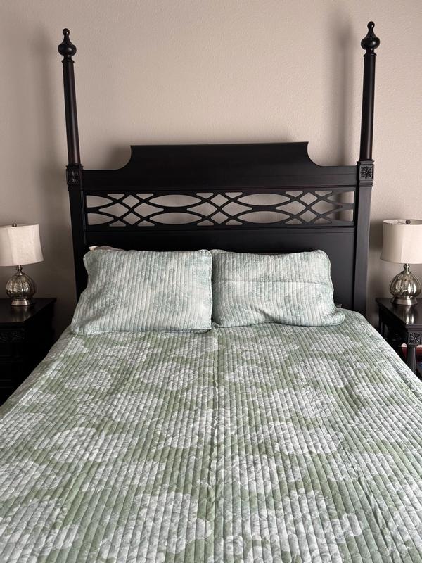 Very sweet floral design. The queen size fits perfectly to my bed. Very durable and comfortable. Quality is perfection. Perfect for a girls room. The scalloped edges add a sweet touch.
