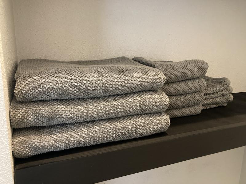 Love the color and texture of this towel set. It is a little thinner than I expected but not a deal breaker since they would dry faster. Great for warmer months.