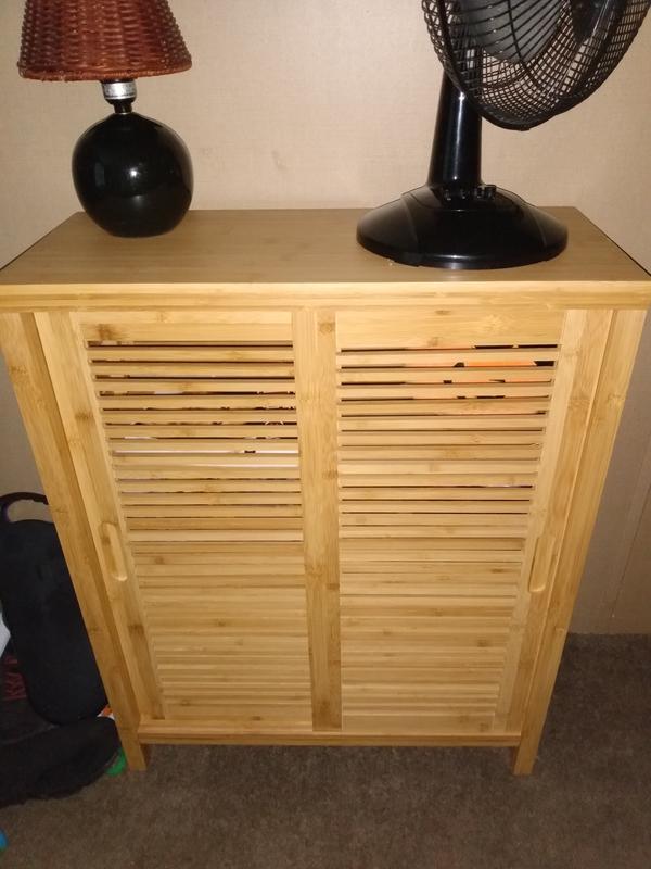 I got this cabinet for storage in my sunroom. It was easy to put together and is a nice bamboo color. It has 2 shelves and sliding doors. One of the doors does not line up right, but that can be fixed and doesn't affect anything except looks. Once put together, it is quite sturdy. I am happy with it.