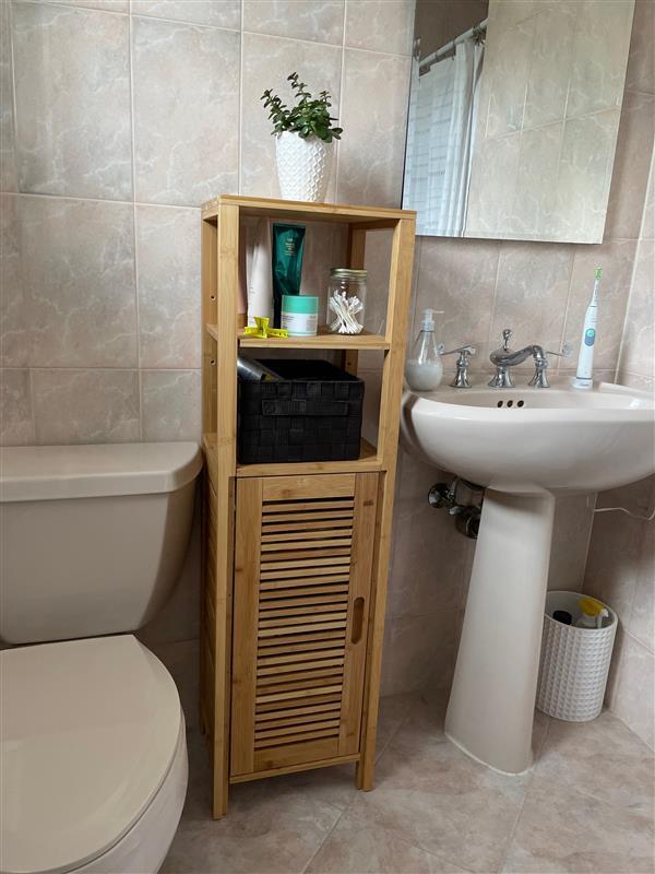 I got this about a week ago and couldn’t wait to put it together. The assembly was so easy and I basically just followed the pictures from the instruction page. Everything fit right into place. It’s made so well, holds so much and fits perfectly in either of my bathrooms. This would make the perfect housewarming gift as it has shelves that can hold quite a bit.