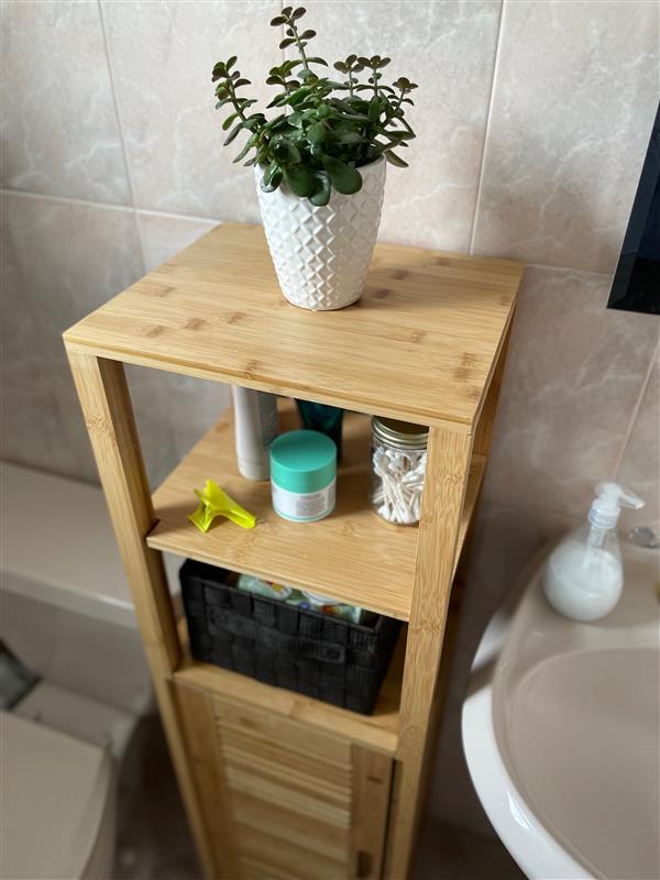 As an employee of Linon, I purchased this item for extra storage in my bathroom. The only storage I had was the mirror cabinet and I needed to hold bigger items, now I can fit my hair tools, extra toilet paper, hair spray, hand towels and other toiletries that don't fit in the mirror. I love it's look, it was very easy to put together and feels sturdy enough to hold up for a while! Now I need to add the bench next!!