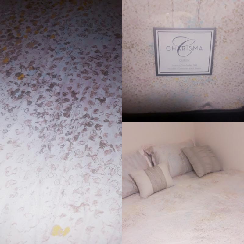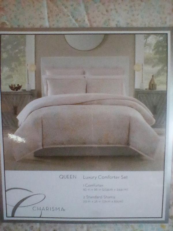 My new Charisma Linstrom Queen 3 Piece Comforter Set is beautiful! This comforter set is the best comforter I have ever owned. I love the beautiful pearlescent colors in the print. The colors are very soft and neutral which will match any decor. The queen size comforter is 92x96 inches and fits perfectly. The comforter is beautifully made and comes with 2 coordinating shams. Made of 100% cotton, this comforter set is elegant. I highly recommend the Charisma Linstrom Queen 3 Piece Comforter Set.