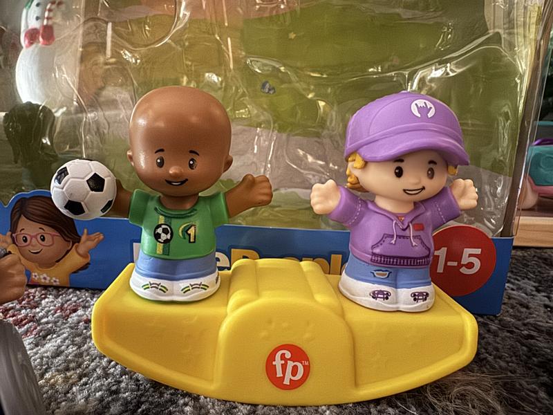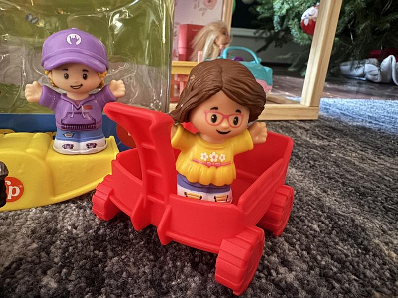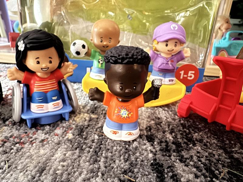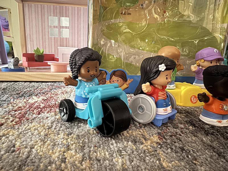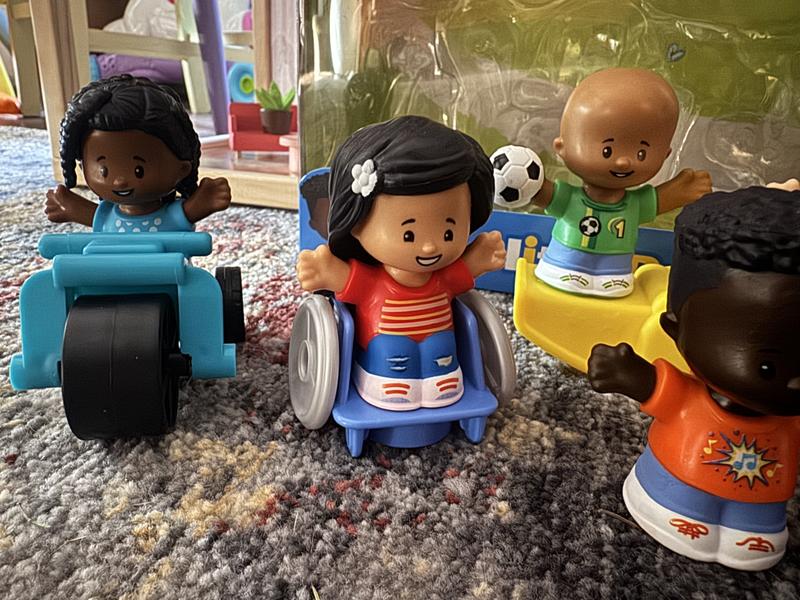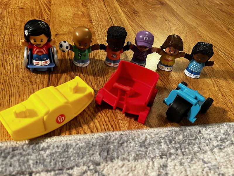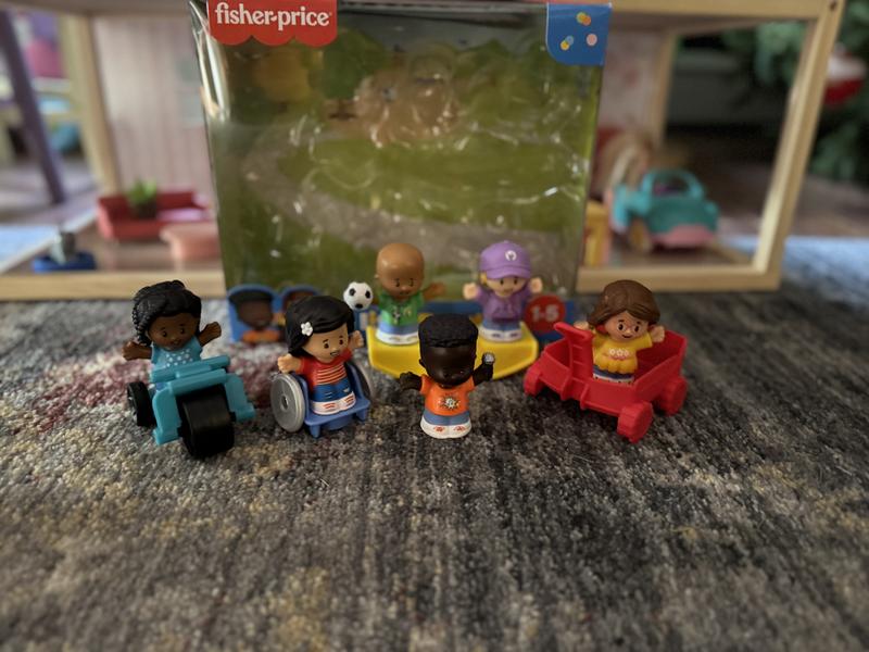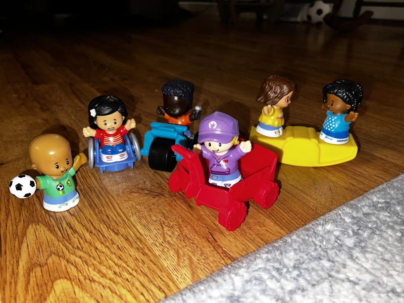 I have two daughters (5 and 4). They both love this little people set. It includes four girls, two boys, a seesaw, a bike, and a wagon. I love that this set has a character with a wheelchair and characters of different skin colors. It helps teach kids that there are people who are different from them. The wheels on the tricycle and the wheelchair spin, but the wheels on the wagon are plastic and don't spin. The child in the wheelchair cannot come out of it. The wagon is the only piece that that character can use. Those are minor details that I noticed. My kids haven't complained about either issue. Overall, this is a great Little People set.