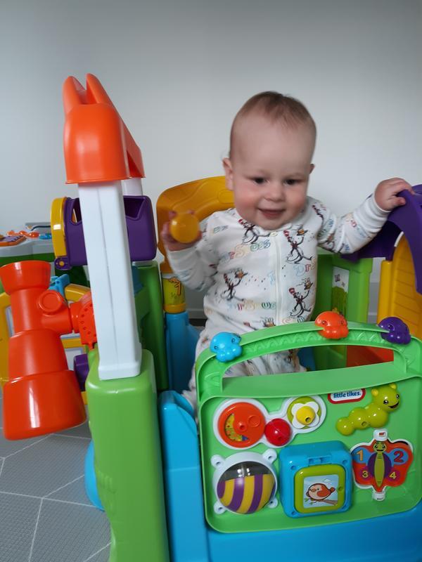 *I tried to upload video, said it was invalid* I LOVE little tikes products, but I’m truly disappointed with this one. My son received this as a gift, and I was so excited about it. It is NOT for older toddlers. My older son (just turned 2 in June) is way too big for it. I wanted it open to fit better in the playpen since my 8.5 month old can’t figure out how to get out of the door or the little slide. It is so flimsy!! The piece the door is on shakes horrible with minimal pressure on it. The stock photos show the slide by the piece the shutters are on when it’s open. It doesn’t fit right, the purple part at the bottom is too far out for them to fit comfortable together. It just seems pretty unsafe for my baby to play with, like it will just fall over on him.