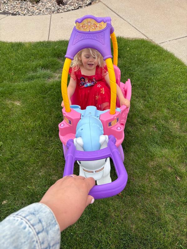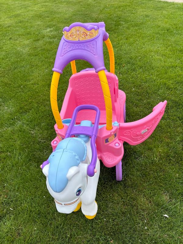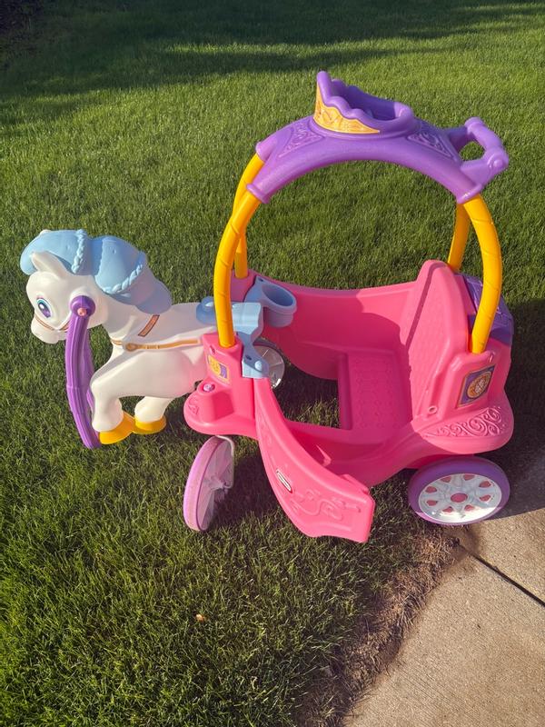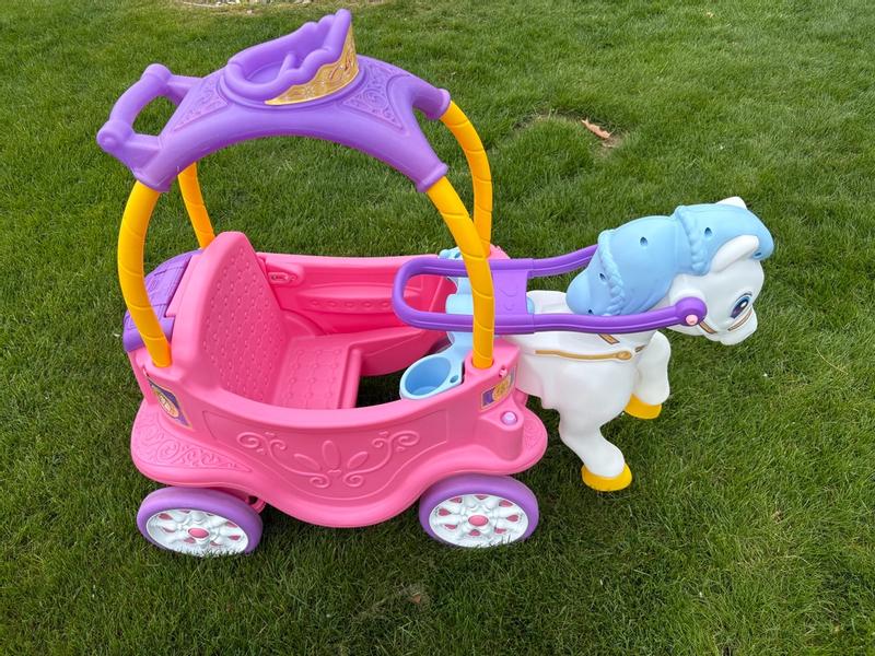 What an adorable princess carriage! It's sturdy and durable, and perfect for anyone's little princess! The assembly was straightforward and didn't take too long. Putting the stickers on was probably the part that took the longest. Our daughter absolutely loves it whether she's moving using her feet or we are pulling her around. It's easy to pull and we love the option of putting the floor piece in so she has somewhere to rest her legs. The horse is such a nice addition and she pretends to feed it all the time. The "trunk" at the back is a great place for her toys or a snack. This would make an amazing gift for any little girl.