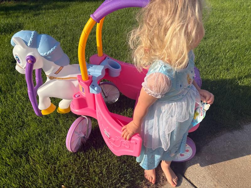 I bought it for my granddaughter’s first birthday. I have always loved little tykes for my kids when they were little. I do love the princess horse and carriage. However, my recommendation would be to put some type of harness or seatbelt inside for the child. My granddaughter fit in it perfect however she was scared, I think because she wasn’t strapped in.