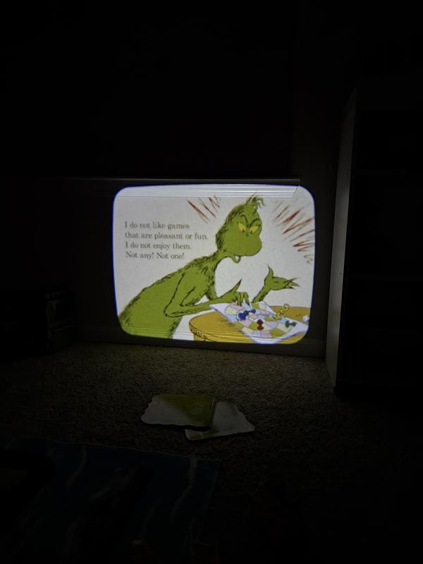 The image is blurry with every page. One page can be clear and the next one is blurry. It’s infuriating to have to fix it with every page, on a stable flat surface. The books are poorly written and the narration is so fake. It’s hard to enjoy the images because they are so blurry. There is a horrible grinding noise to rewind each book and between each slide. Don’t fall for the hype. This toy is useless because of how poor quality it is.