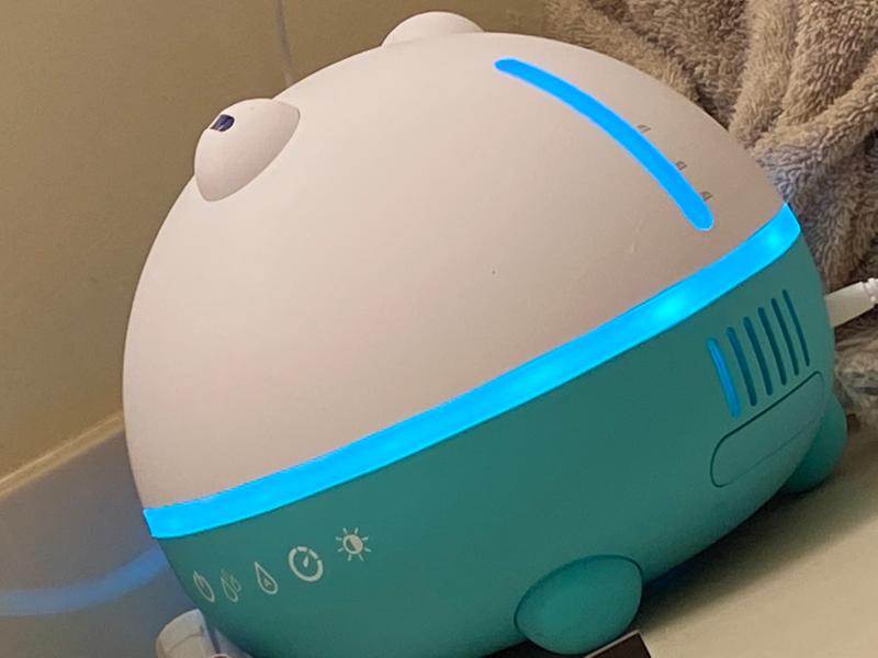 Very cute design and great functionality easy to tie into my sons bedroom furniture and toys looks like a cute light up toy releases a quiet mist no loud noise and serves as a cute night light has been dropped a few rimes by my toddler and worls perfectly very durable