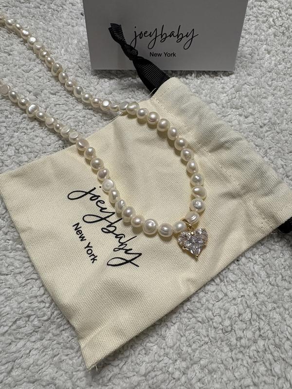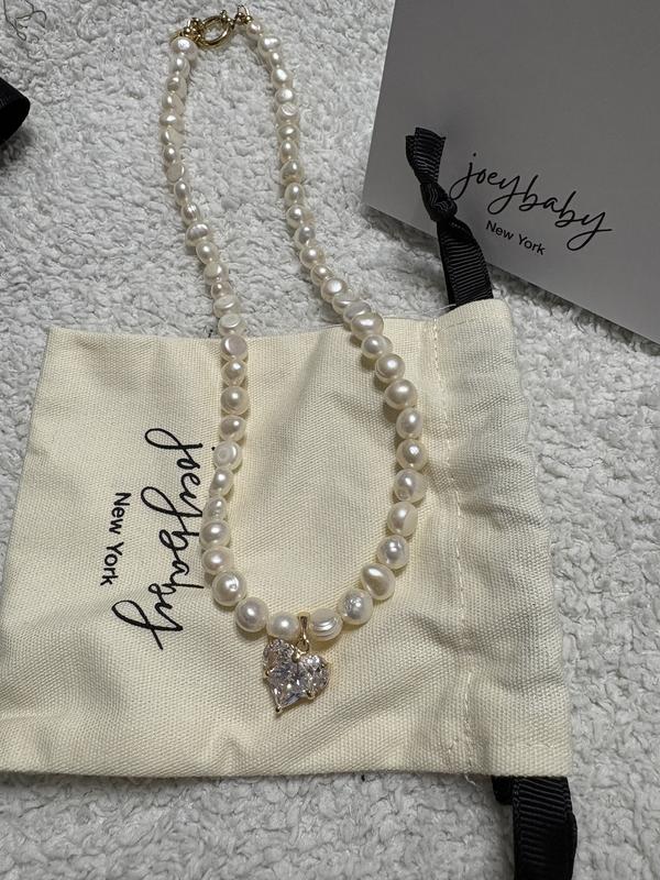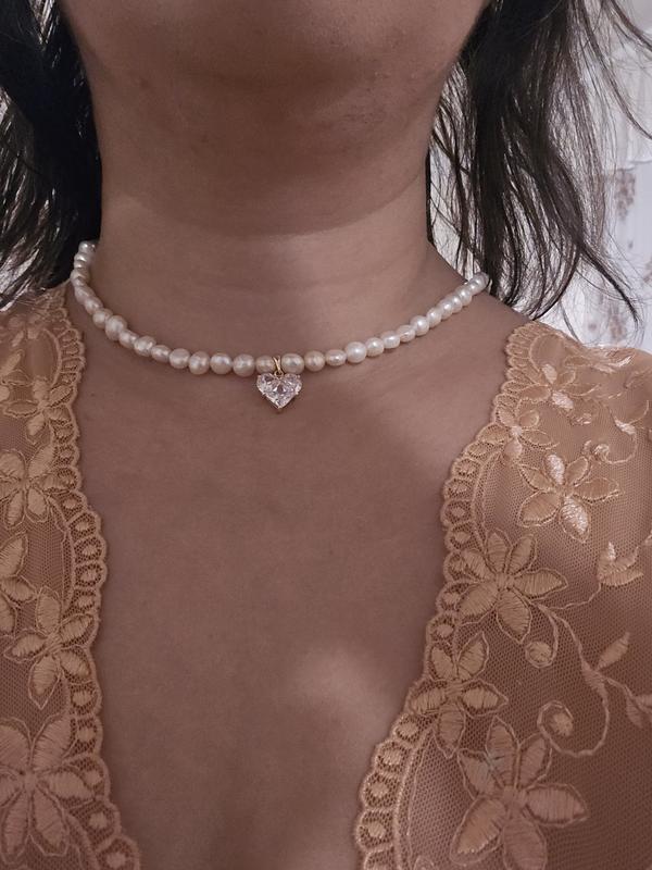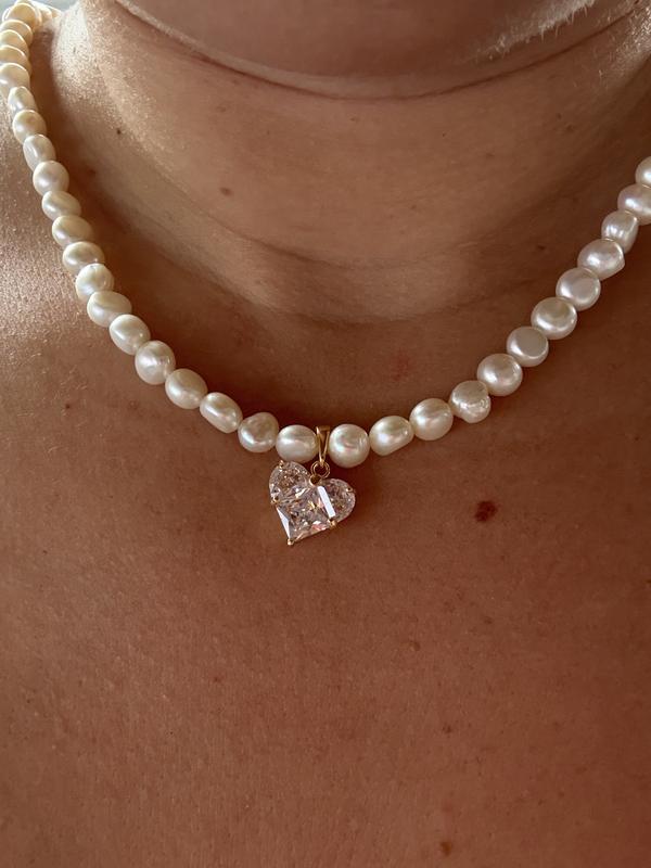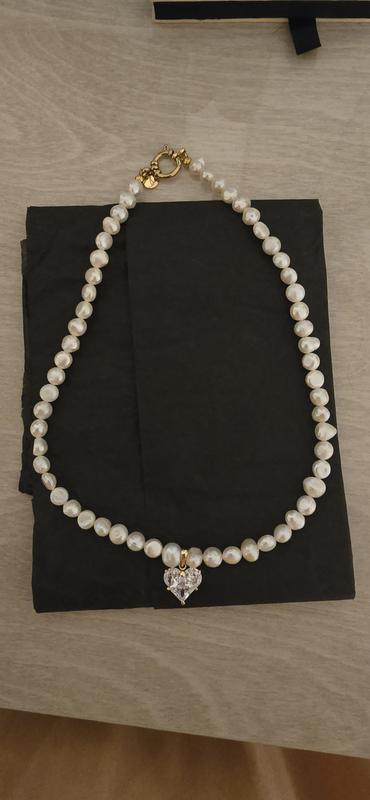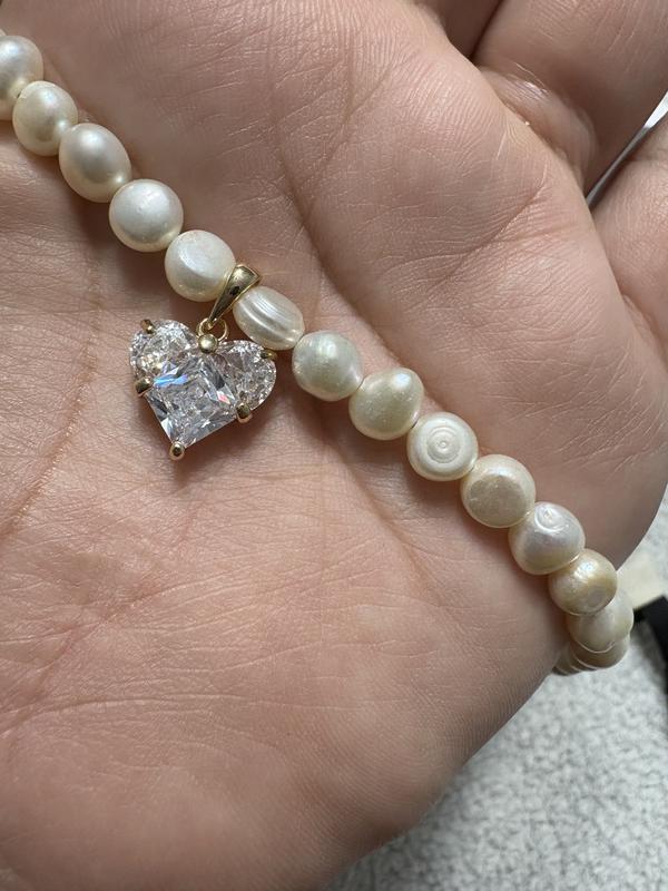 This faux pearl necklace with a diamond heart pendant is really beautiful. The heart charm sparkles nicely in the light. The necklace is lightweight and comfortable to wear, making it perfect for dressy occasions or everyday outfits. The clasp seems sturdy as well. However, the pearls are not the same size or shape so if you like a little variation in your pearls then this product is for you.