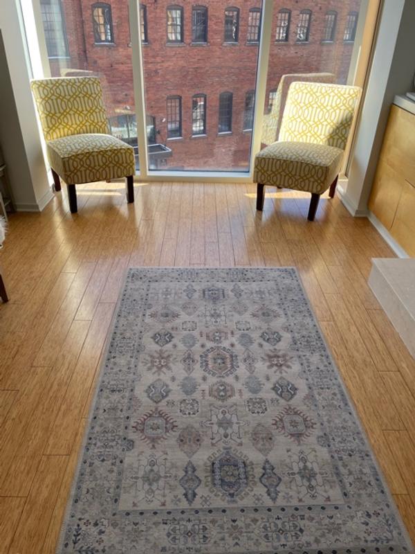 I really love this area rug, I want one in a larger size now. It has a very nice cushion feel to walk on, and my favorite thing about it is how easy it is flit vacuum it. Nothing clings to it and it doesn’t get caught up in the vacuum. My only con about it is I wish it had a better grip, it does slide around on my wood floors.