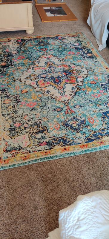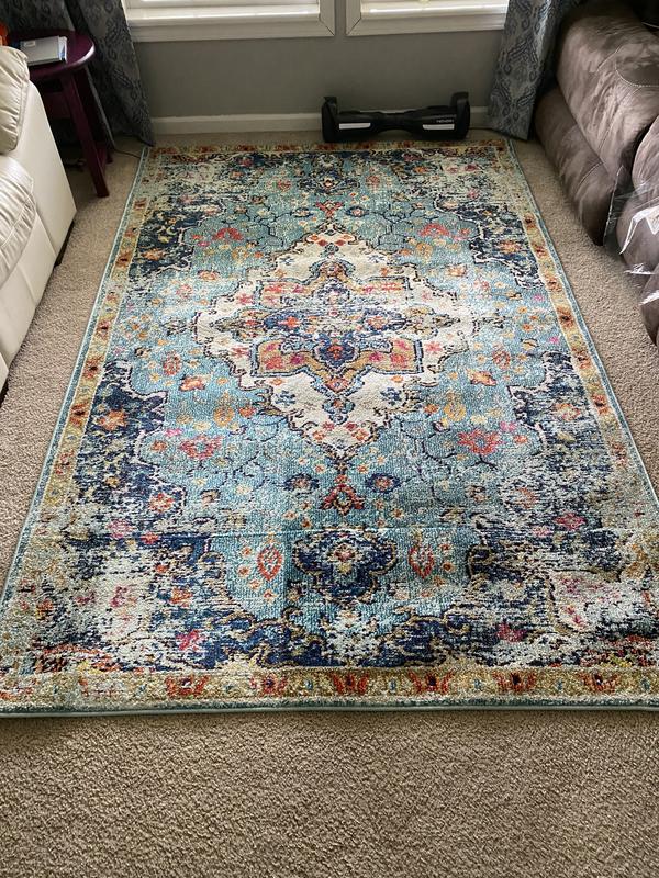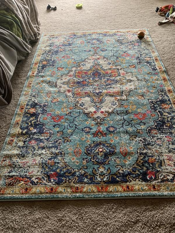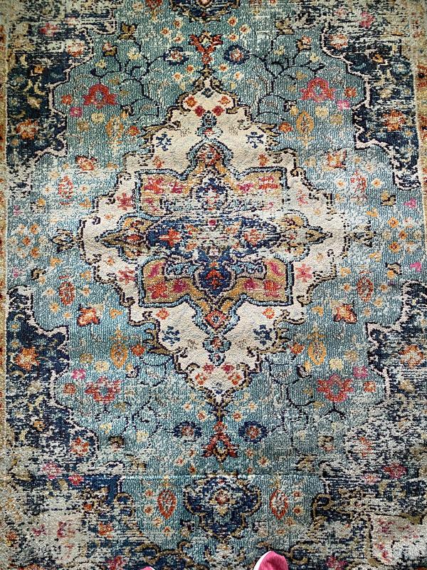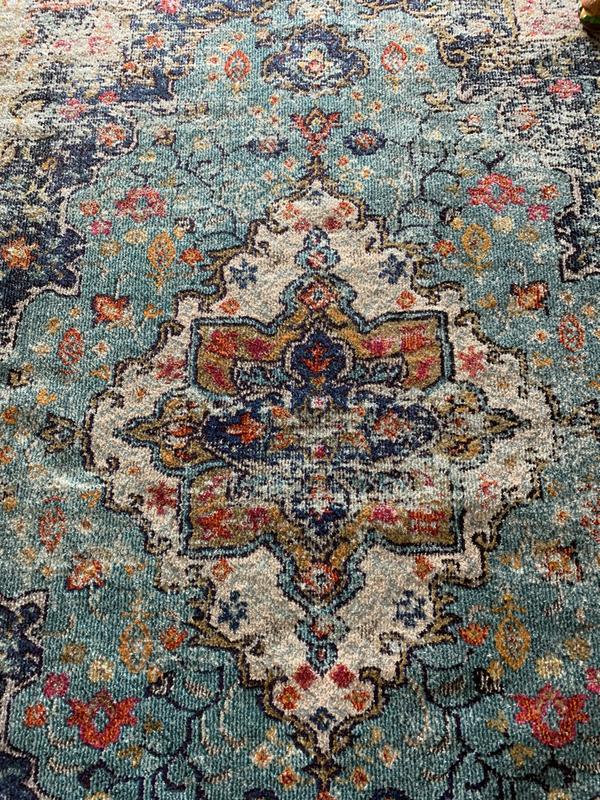 This rug is absolutely stunning. I love the aqua blue (fits right in with my decor), and the deep pink and yellow accent colors really compliment the blue and "pop". It has a traditional looking design, but has been given a bit of an aged/ distressed appearance which adds to the charm of the rug. It is very well made---thick, durable, and also very soft. It is the kind of rug that I expect to last for many years. I have vacuumed it several times in the month that I have had it, and there has not been any pilling or snags. I also have even done yoga on it, and was impressed with the soft texture. Recently, I had a house appraisal... and the appraisers both commented on how pretty the rug is. Overall, I am extremely pleased. The rug is beautiful, and very well-made. It brings color to my home.