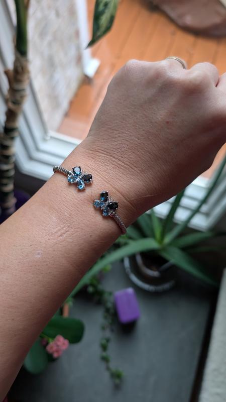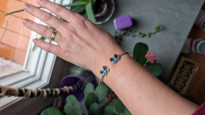 I love this butterfly bracelet in the Blue Topaz. Received it as a birthday gift, and it is more beautiful in person than the picture. It is great even if you have a small wrist, like I do, as it expands and easily goes on and off your wrist, without the risk of it being too loose. The bangle itself is a pretty texture, and the butterflies are large and very pretty. I don't have any bracelets like it.
