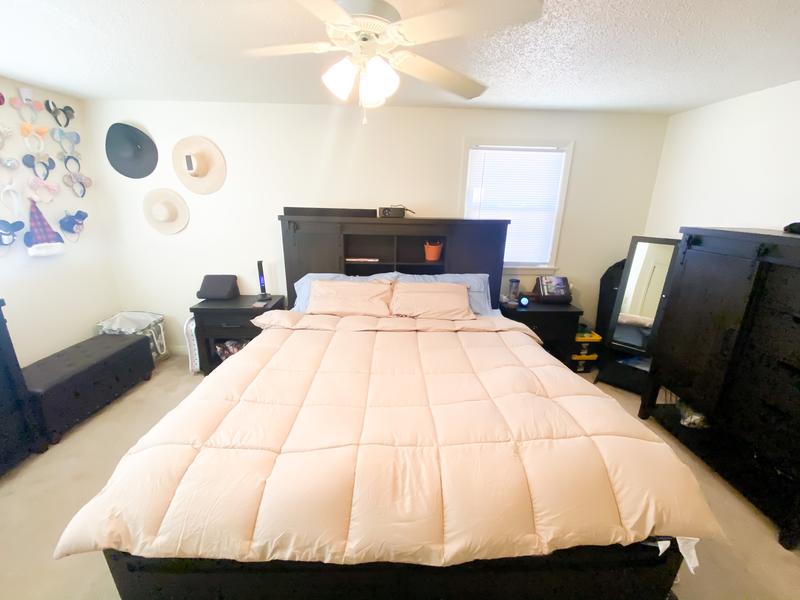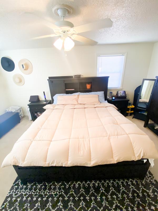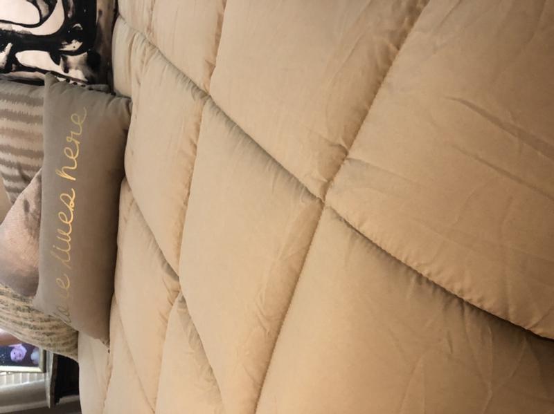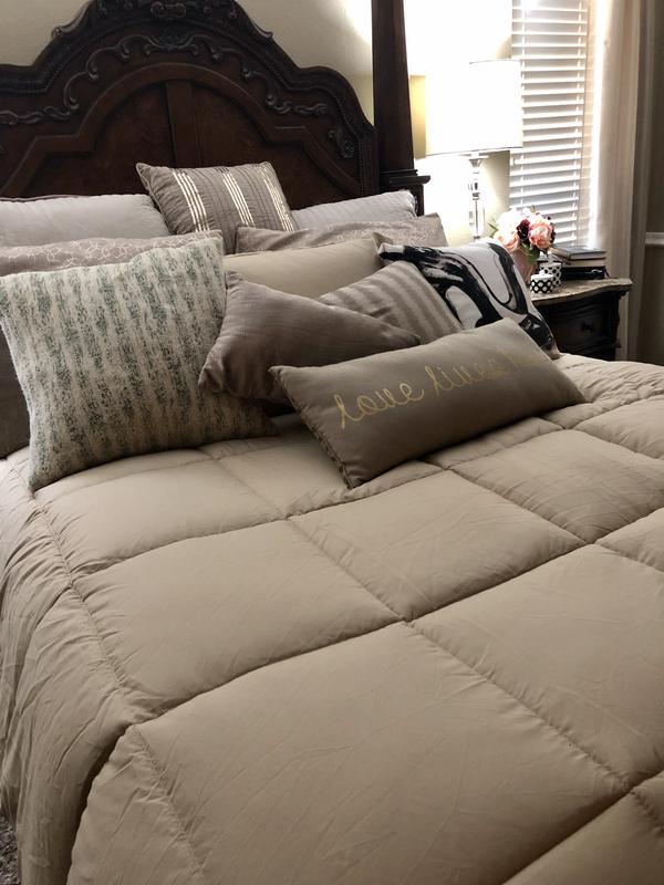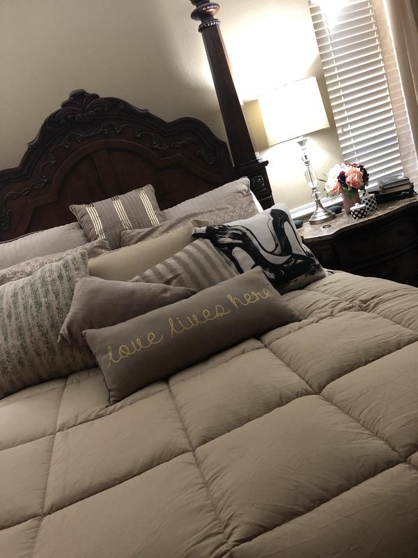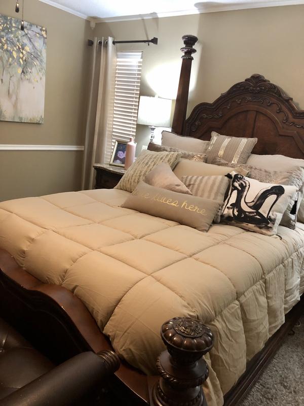 I love to change out my comforters and bedspreads and love the feel of down. This being a down alt comforter I wasn’t quite sure about it but when it was delivered and I felt it inside the package and knew right away I was going to love it. I’m hot natured and I don’t want to be warm when I’m sleeping. This comforter is just the right weight and it is super soft. I would say that it could be a little bit bigger to fit beds that are larger and have thicker mattresses, but it still covered everywhere it needed to. The one thing I did not like about the comforter set are the pillow shams. I felt they could’ve been more like the comforter but they seemed really cheap. Otherwise, I would’ve given the set a complete five stars! And the color is exactly like it was pictured online. I’ve shown how it looks with full lighting and lamps only in photos for reference.
