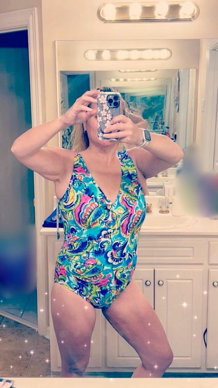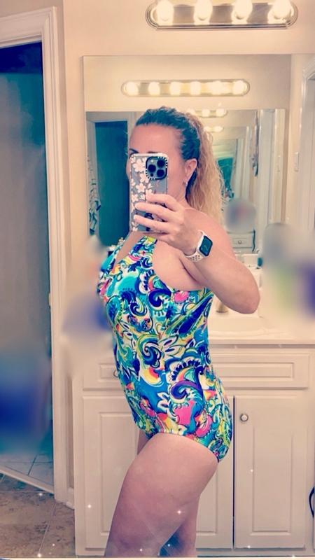 The most flattering swimsuit I have tried in a long while. Hard to find long suits. Also the suit stays in place and leg openings do NOT ride up. The ruffle adds a feminine touch. Love, love!!