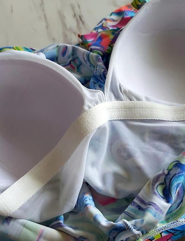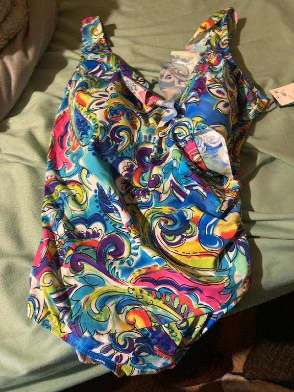 It’s very bright and colors are beautiful. I recently lost 56 lbs so was worried about fit, but this fits really well. I have a long torso and Longitude are made for that. I didn’t know about the ruffle but you can’t even notice it. Glad I got it.