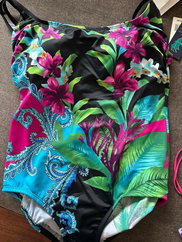 Love the bright colors on the suit front and back. Like when color goes all around the suit. Still not a fan of the square neck, like the round neck better. But really like this suit.