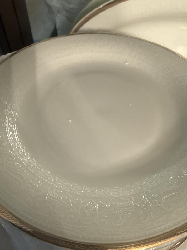 Exquisite. The gold is more of an antique gold, not as golden as it appears on the pics. The floral lattice type design border, barely evident in the pics, adds sooo much to the set. So delicate and done with such good taste. I am thrilled with this dinnerware. No good reason to buy it except that it was time for me to finally have a dinnerware set... I am almost 50. Could not have pampered myself with a better set. Perfectly packed.