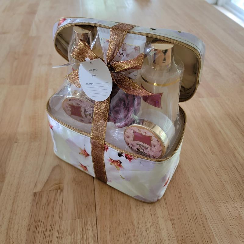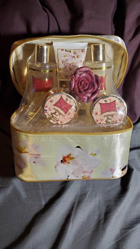 This is a nice and easy gift set to give to an acquaintance. Quality-wise, I'd give it a 3/5. But value-wise, I'd give it a 4/5. The whole thing was packaged nicely just as pictured (raised up by a piece of Styrofoam underneath the products. Everything smells nice, but the red rose soap definitely needs to be in a soap dish or the color will flow onto the side of your tub. The travel bag is soft and a nice touch!