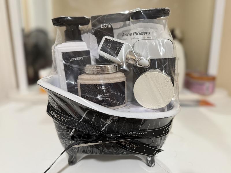 My Lovery Lavender Birthday Bath and Body Gift Basket was even more than I hoped for. There are so many quality products included in the basket and I have been very satisfied with all of them. The lavender fragrance is just how I like it, not too strong, and the set includes everything for a full spa experience. Included in the set is a nail manicure set, body scrub, lip balm, bath salts, bath oil, shower gel, bubble bath, acne plasters and a shower steamer tablet. The products are designed for all skin types and since I have dry skin, I really like the moisturizing effects from these products. I definitely recommend this gift basket, either as a gift for someone else, or even better as a gift for yourself!