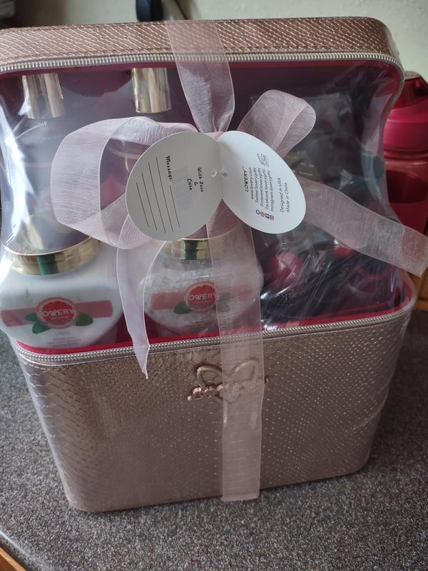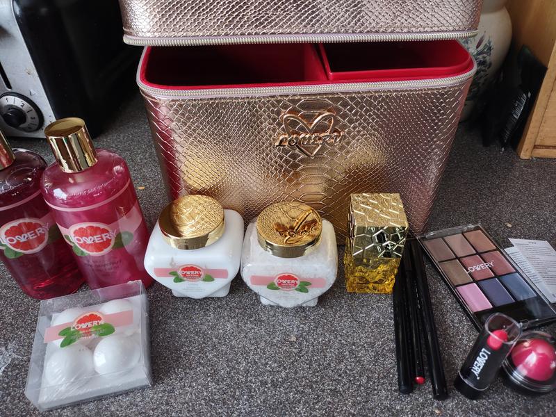 This gift set is fantastic. The presentation is beautiful while the case is practical and well made. All the items fit nicely in the kit. It is also able to hold much more than just what comes with the set. The grapefruit scent of the bath items is pleasant without being overwhelming. The shower gel is my favorite item of the bath set but the lotion is also really nice. It doesn't feel greasy or heavy on my skin. I love the pencils and the lip balm from the makeup set included. I also really like the portable blush brush and keep in the makeup bag in my purse. I love the variety of items included in this set. It's a well rounded gift.