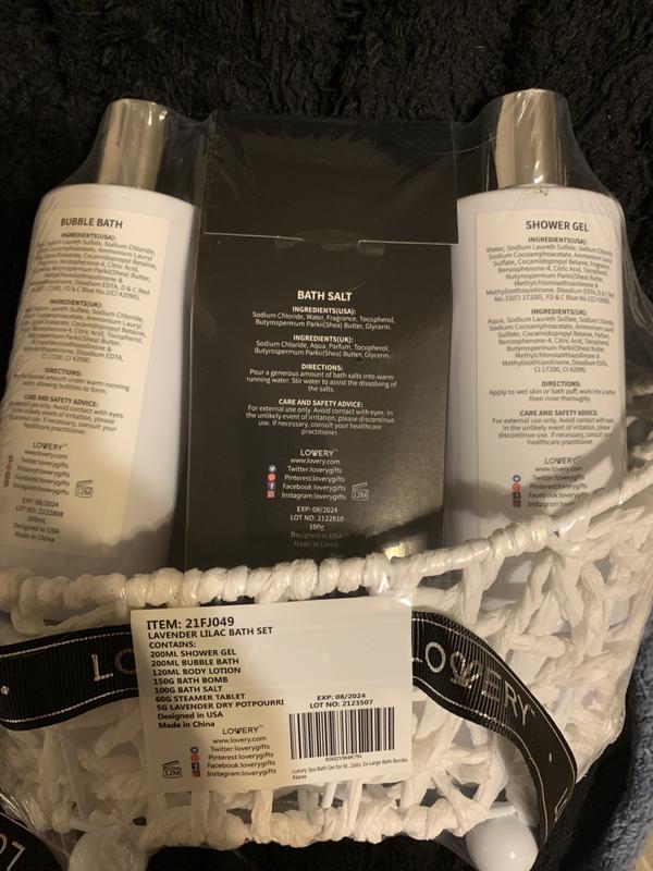 This gift set looked pretty nice in the basket that it was packaged in, but upon looking closer at the packaging, the products looked a little bit bootleg. I don't know how else to describe it. They look sort of like the brands that you find at a dollar store. 1) The shower gel was alright, a little too perfumey and not very moisturizing, but I'll use it. 2) The lotion is awful, reminiscent of the type you used to get in hotels that never fully rubs in 3) I haven't used much potpourri, but I've only ever seen potpourri that comes in the form of dried flower petals. This potpourri is just little buds and twigs. It smelled very fragrant at first, but now 3 days later they don't smell of much 4) Shower steamer - it lasted for 4+ showers, I'm not sure what it was supposed to do though, it didn't seem to do anything but stain my tub. Days later and after plenty of scrubbing, the purple stain is still there. 5) Bath salts - these were fine, no complaints about using them in my bath, but I'm not sure about the ingredients 6) Bath bomb - the ingredients on this are troubling and it's full of coloring and fragrance. It doesn't appear to have any purpose other than making the bath purple. Women need to be careful about the bath products we use as they may irritate intimate areas, we should stick to natural ingredients only, and this is NOT what Lovery delivers. Overall, just about everything seems to be full of coloring, fragrance, and other chemicals. These are not natural products.