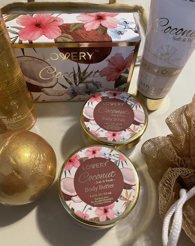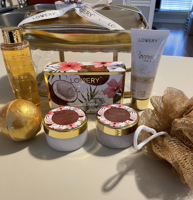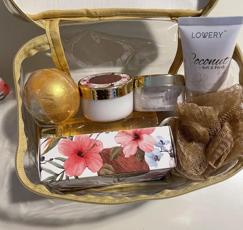 The Coconut Bath and Body Kit has everything you need to to treat yourself to an at home spa day! Included are body scrub, bath salts, body butter, shower gel, hand cream, a bath bomb and bath poof. It all comes in a reusable zippered bag. The coconut scent is light and not over powering. This would be an excellent gift or a treat for yourself.