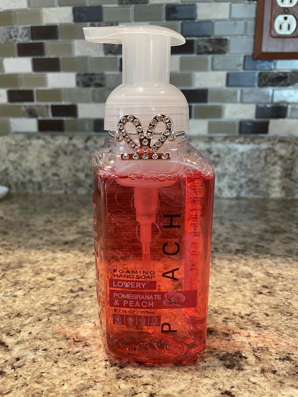 The container is a perfect size to have on the side of my sinks. They other up beautifully and leave my hands feeling clean and fresh! The crystal that hangs from them are just precious! I have three scents and they are all great, I will continue to purchase them!